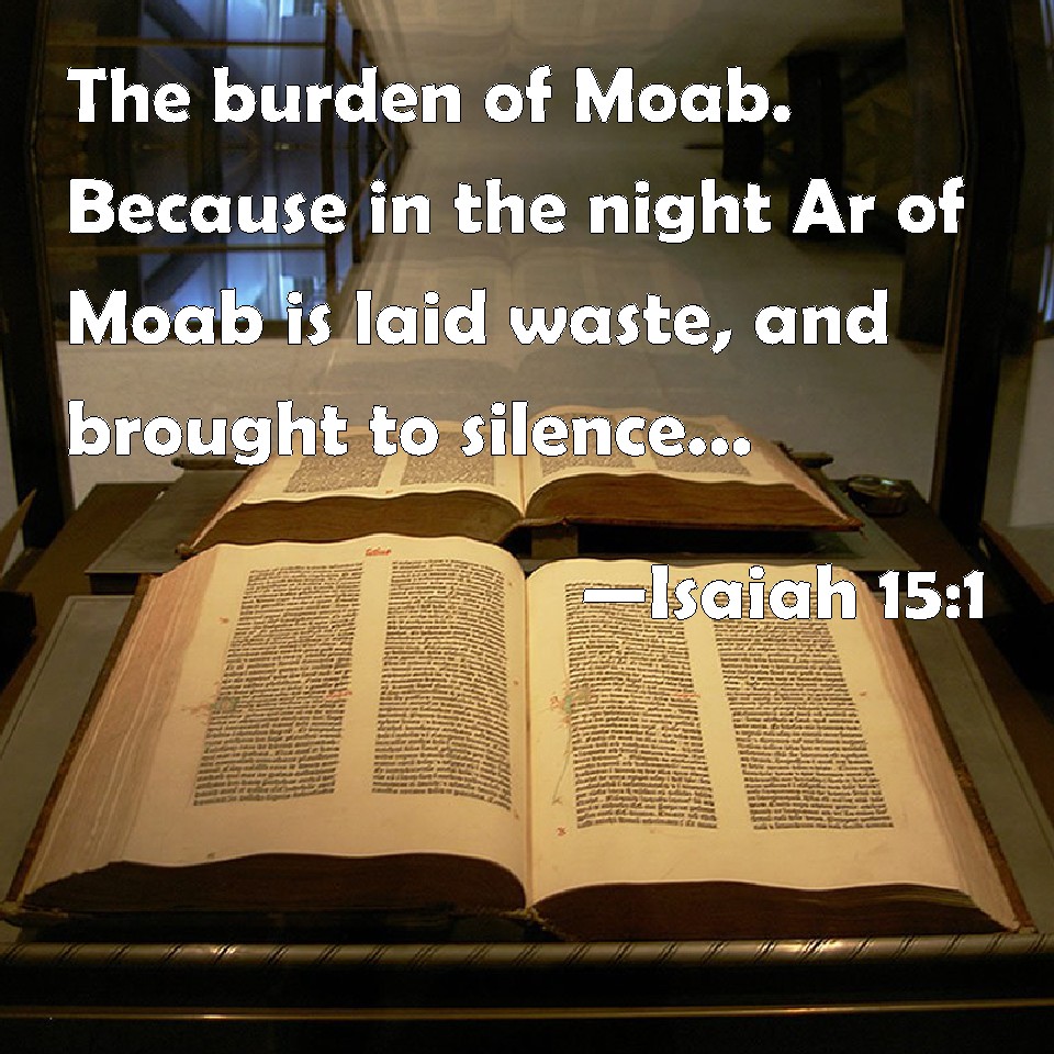 Choose a Background Isaiah 15:1 The burden of Moab. Because in the night Ar of Moab is laid waste, and brought to silence; because in the night Kir of Moab is laid waste, and brought to silence; KJV: The burden of Moab. Because in the night Ar of Moab is laid waste, and brought to silence; because in the night Kir of Moab is laid waste, and brought to silence; DRB: THE burden of Moab. Because in the night Ar of Moab is laid waste, it is silent: because the wall of Moab is destroyed in the night, it is silent. DBT: The burden of Moab: For in the night of being laid waste, Ar of Moab is destroyed; for in the night of being laid waste, Kir of Moab is destroyed! ERV: The burden of Moab. For in a night Ar of Moab is laid waste, and brought to nought; for in a night Kir of Moab is laid waste, and brought to nought. WBT: The burden of Moab. Because in the night Ar of Moab is laid waste, and brought to silence; because in the night Kir of Moab is laid waste, and brought to silence; WEB: The burden of Moab: for in a night, Ar of Moab is laid waste, and brought to nothing; for in a night Kir of Moab is laid waste, and brought to nothing. YLT: The burden of Moab. Because in a night destroyed was Ar of Moab — It hath been cut off, Because in a night destroyed was Kir of Moab — It hath been cut off.Links Isaiah 15:1 NIV • Isaiah 15:1 NLT • Isaiah 15:1 ESV • Isaiah 15:1 NASB • Isaiah 15:1 KJV • Isaiah 15:1 Interlinear • Isaiah 15:1 Commentaries • Isaiah 15:1 Parallel Texts • Isaiah 15:1 Bible Apps • Isaiah 15:1 Parallel • Bible Hub |