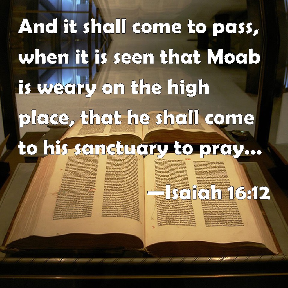 Choose a Background Isaiah 16:12 And it shall come to pass, when it is seen that Moab is weary on the high place, that he shall come to his sanctuary to pray; but he shall not prevail. KJV: And it shall come to pass, when it is seen that Moab is weary on the high place, that he shall come to his sanctuary to pray; but he shall not prevail. DRB: And it shall come to pass, when it is seen that Moab is wearied on his high places, that he shall go in to his sanctuaries to pray, and shall not prevail. DBT: And it shall come to pass, when Moab shall appear, shall weary himself on the high place, and enter into his sanctuary to pray, that he shall not prevail. ERV: And it shall come to pass, when Moab presenteth himself, when he wearieth himself upon the high place, and shall come to his sanctuary to pray, that he shall not prevail. WBT: And it shall come to pass, when it is seen that Moab is weary on the high place, that he shall come to his sanctuary to pray; but he shall not prevail. WEB: It will happen that when Moab presents himself, when he wearies himself on the high place, and comes to his sanctuary to pray, that he will not prevail. YLT: And it hath come to pass, when it hath been seen, That weary hath been Moab on the high place, And he hath come unto his sanctuary to pray, And is not able.Links Isaiah 16:12 NIV • Isaiah 16:12 NLT • Isaiah 16:12 ESV • Isaiah 16:12 NASB • Isaiah 16:12 KJV • Isaiah 16:12 Interlinear • Isaiah 16:12 Commentaries • Isaiah 16:12 Parallel Texts • Isaiah 16:12 Bible Apps • Isaiah 16:12 Parallel • Bible Hub |