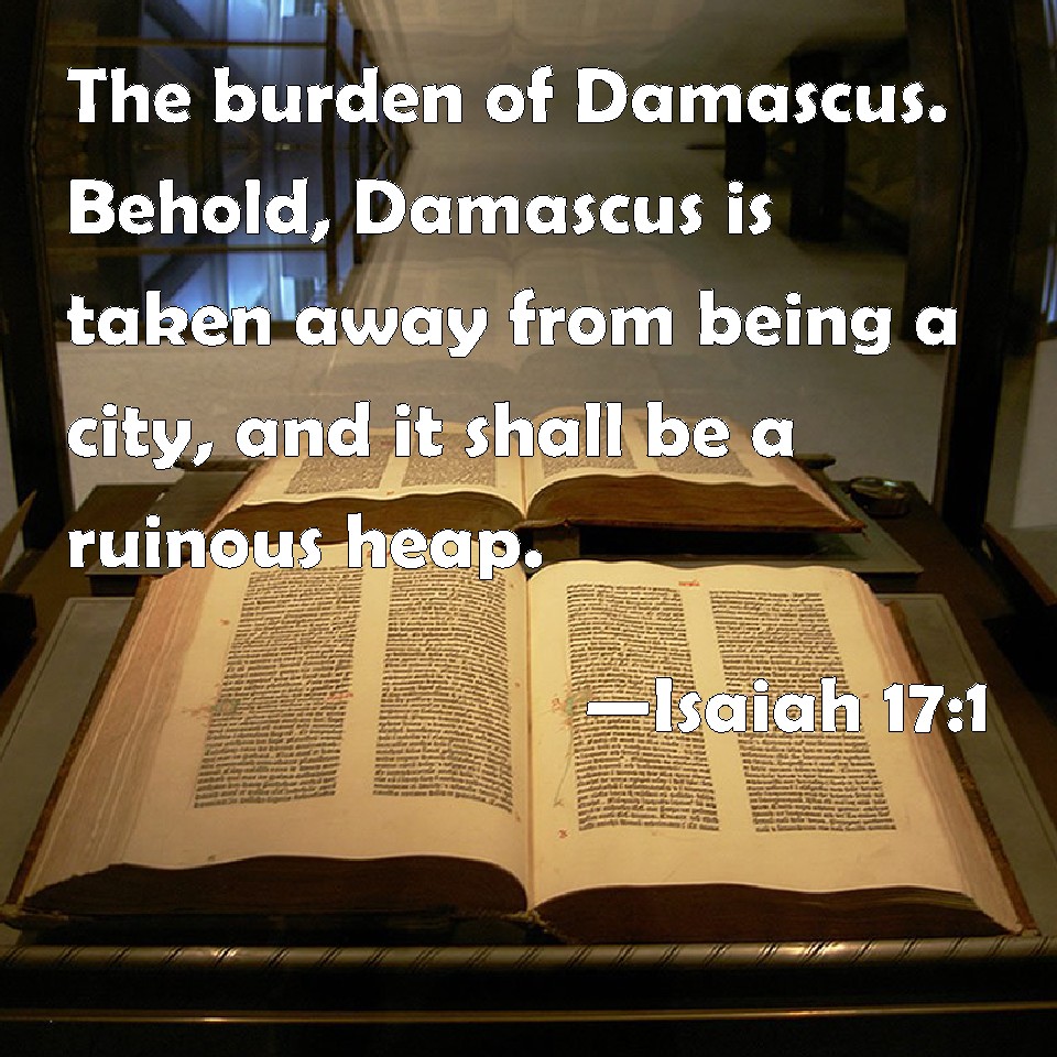 Choose a Background Isaiah 17:1 The burden of Damascus. Behold, Damascus is taken away from being a city, and it shall be a ruinous heap. KJV: The burden of Damascus. Behold, Damascus is taken away from being a city, and it shall be a ruinous heap. DRB: THE burden of Damascus. Behold Damascus shall cease to be a city, and shall be as a ruinous heap of stones. DBT: The burden of Damascus. Behold, Damascus is taken away from being a city, and it shall be a ruinous heap. ERV: The burden of Damascus. Behold, Damascus is taken away from being a city, and it shall be a ruinous heap. WBT: The burden of Damascus. Behold, Damascus is taken away from being a city, and it shall be a ruinous heap. WEB: The burden of Damascus: "Behold, Damascus is taken away from being a city, and it will be a ruinous heap. YLT: The burden of Damascus. Lo, Damascus is taken away from being a city, And it hath been a heap — a ruin.Links Isaiah 17:1 NIV • Isaiah 17:1 NLT • Isaiah 17:1 ESV • Isaiah 17:1 NASB • Isaiah 17:1 KJV • Isaiah 17:1 Interlinear • Isaiah 17:1 Commentaries • Isaiah 17:1 Parallel Texts • Isaiah 17:1 Bible Apps • Isaiah 17:1 Parallel • Bible Hub |
