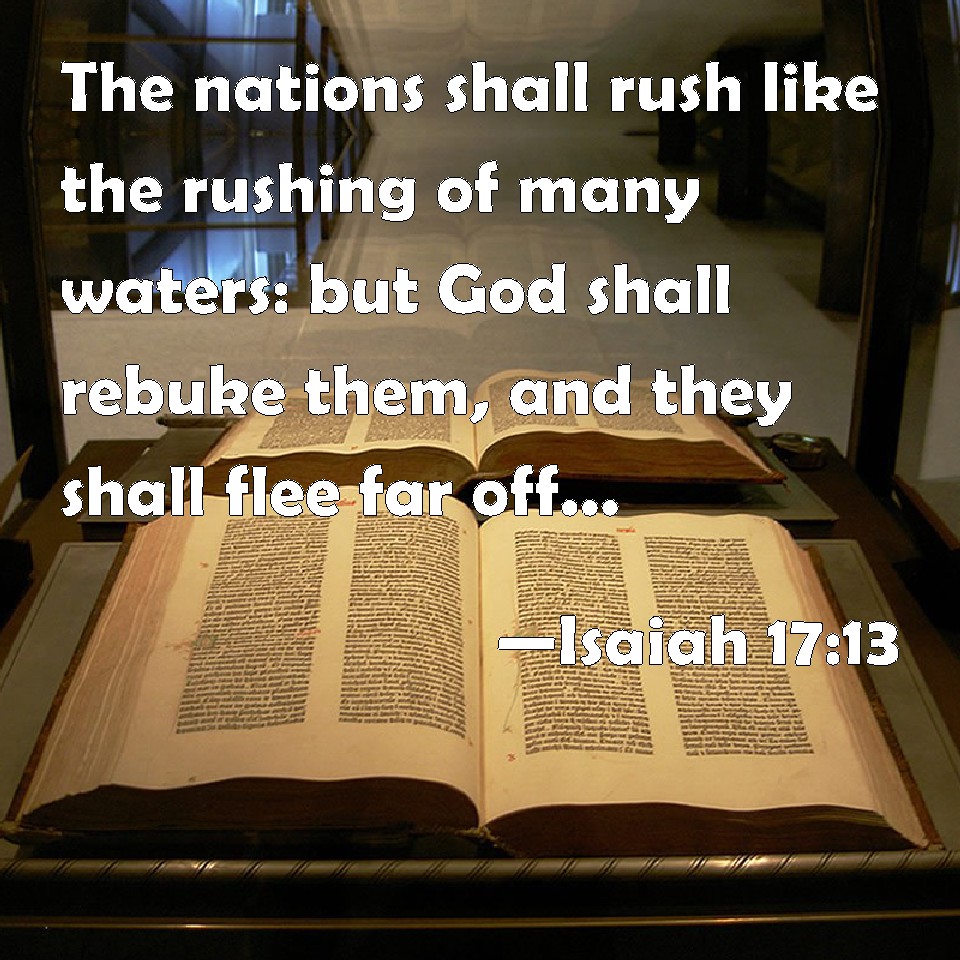 Choose a Background Isaiah 17:13 The nations shall rush like the rushing of many waters: but God shall rebuke them, and they shall flee far off, and shall be chased as the chaff of the mountains before the wind, and like a rolling thing before the whirlwind. KJV: The nations shall rush like the rushing of many waters: but God shall rebuke them, and they shall flee far off, and shall be chased as the chaff of the mountains before the wind, and like a rolling thing before the whirlwind. DRB: Nations shall make a noise like the noise of waters overflowing, but he shall rebuke him, and he shall flee far off: and he shall be carried away as the dust of the mountains before the wind, and as a whirlwind before a tempest. DBT: The nations rush as the rushing of many waters; but he will rebuke them, and they shall flee far away, and shall be chased as the chaff of the mountains before the wind, and like a whirling of dust before the whirlwind: ERV: The nations shall rush like the rushing of many waters: but he shall rebuke them, and they shall flee far off, and shall be chased as the chaff of the mountains before the wind, and like the whirling dust before the storm. WBT: The nations shall rush like the rushing of many waters: but God will rebuke them, and they shall flee far off, and shall be chased as the chaff of the mountains before the wind, and like a rolling thing before the whirlwind. WEB: The nations will rush like the rushing of many waters: but he will rebuke them, and they will flee far off, and will be chased like the chaff of the mountains before the wind, and like the whirling dust before the storm. YLT: Nations as the wasting of many waters are wasted, And He hath pushed against it, And it hath fled afar off, And been pursued as chaff of hills before wind, And as a rolling thing before a hurricane.Links Isaiah 17:13 NIV • Isaiah 17:13 NLT • Isaiah 17:13 ESV • Isaiah 17:13 NASB • Isaiah 17:13 KJV • Isaiah 17:13 Interlinear • Isaiah 17:13 Commentaries • Isaiah 17:13 Parallel Texts • Isaiah 17:13 Bible Apps • Isaiah 17:13 Parallel • Bible Hub |