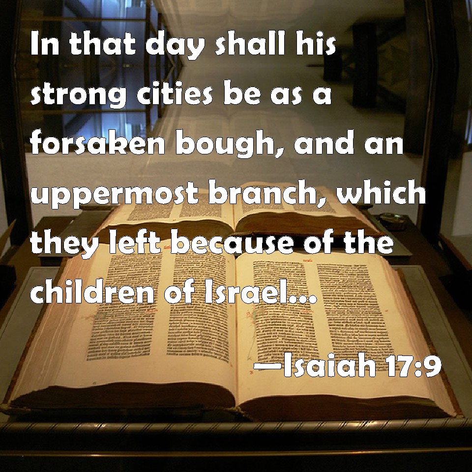 Choose a Background Isaiah 17:9 In that day shall his strong cities be as a forsaken bough, and an uppermost branch, which they left because of the children of Israel: and there shall be desolation. KJV: In that day shall his strong cities be as a forsaken bough, and an uppermost branch, which they left because of the children of Israel: and there shall be desolation. DRB: In that day his strong cities shall be forsaken, as the ploughs, and the corn that were left before the face of the children of Israel, and thou shalt be desolate. DBT: In that day shall his strong cities be as the forsaken tract in the woodland, and the mountain-top which they forsook before the children of Israel; and there shall be desolation. ERV: In that day shall his strong cities be as the forsaken places in the wood and on the mountain top, which were forsaken from before the children of Israel: and it shall be a desolation. WBT: In that day shall his strong cities be as a forsaken bough, and an uppermost branch, which they left because of the children of Israel: and there shall be desolation. WEB: In that day, their strong cities will be like the forsaken places in the woods and on the mountain top, which were forsaken from before the children of Israel; and it will be a desolation. YLT: In that day are the cities of his strength As the forsaken thing of the forest, And the branch that they have left, Because of the sons of Israel, It also hath been a desolation.Links Isaiah 17:9 NIV • Isaiah 17:9 NLT • Isaiah 17:9 ESV • Isaiah 17:9 NASB • Isaiah 17:9 KJV • Isaiah 17:9 Interlinear • Isaiah 17:9 Commentaries • Isaiah 17:9 Parallel Texts • Isaiah 17:9 Bible Apps • Isaiah 17:9 Parallel • Bible Hub |