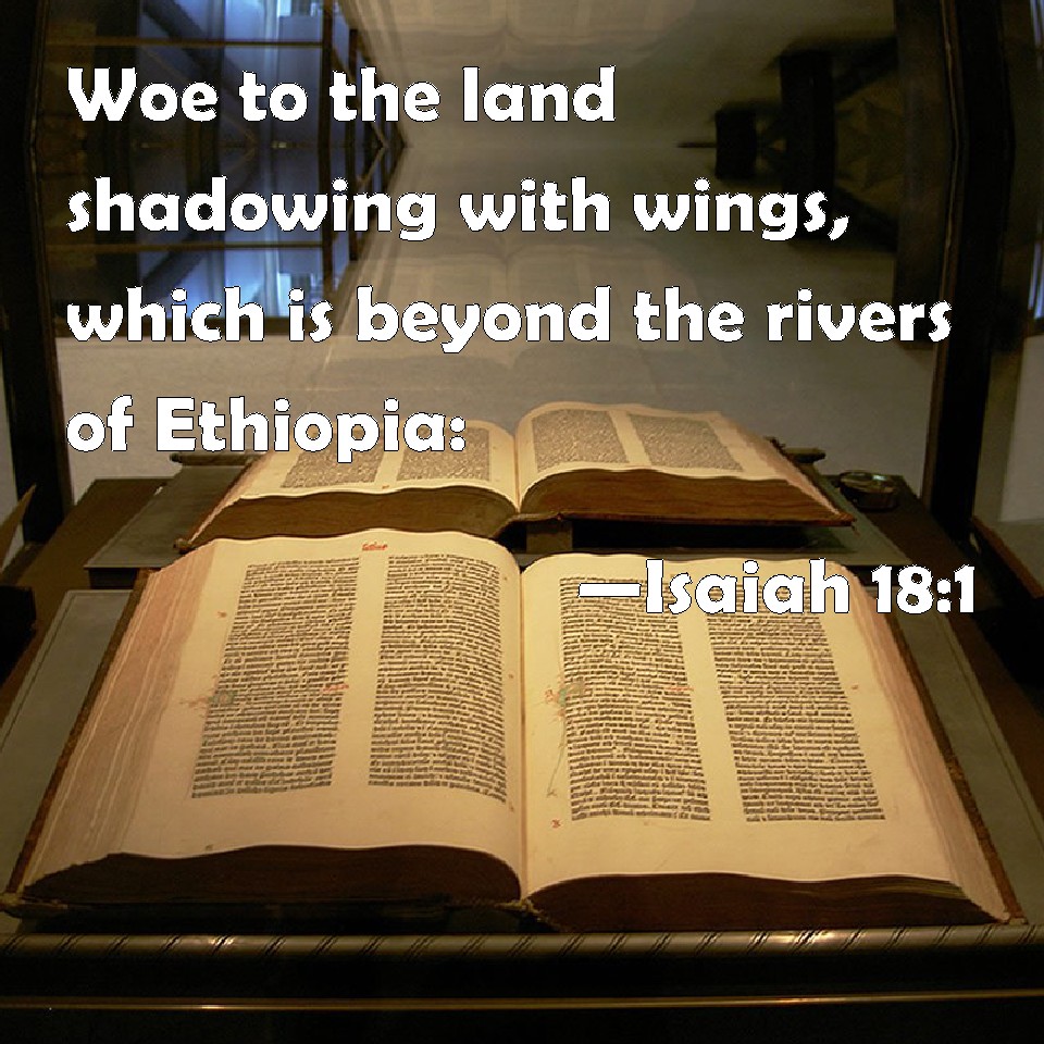 Choose a Background Isaiah 18:1 Woe to the land shadowing with wings, which is beyond the rivers of Ethiopia: KJV: Woe to the land shadowing with wings, which is beyond the rivers of Ethiopia: DRB: WOE to the land, the winged cymbal, which is beyond the rivers of Ethiopia, DBT: Ha! land shadowing with wings, which art beyond the rivers of Cush, ERV: Ah, the land of the rustling of wings, which is beyond the rivers of Ethiopia: WBT: Woe to the land shadowing with wings, which is beyond the rivers of Cush: WEB: Ah, the land of the rustling of wings, which is beyond the rivers of Ethiopia; YLT: Ho, land shadowed with wings, That is beyond the rivers of Cush,Links Isaiah 18:1 NIV • Isaiah 18:1 NLT • Isaiah 18:1 ESV • Isaiah 18:1 NASB • Isaiah 18:1 KJV • Isaiah 18:1 Interlinear • Isaiah 18:1 Commentaries • Isaiah 18:1 Parallel Texts • Isaiah 18:1 Bible Apps • Isaiah 18:1 Parallel • Bible Hub |