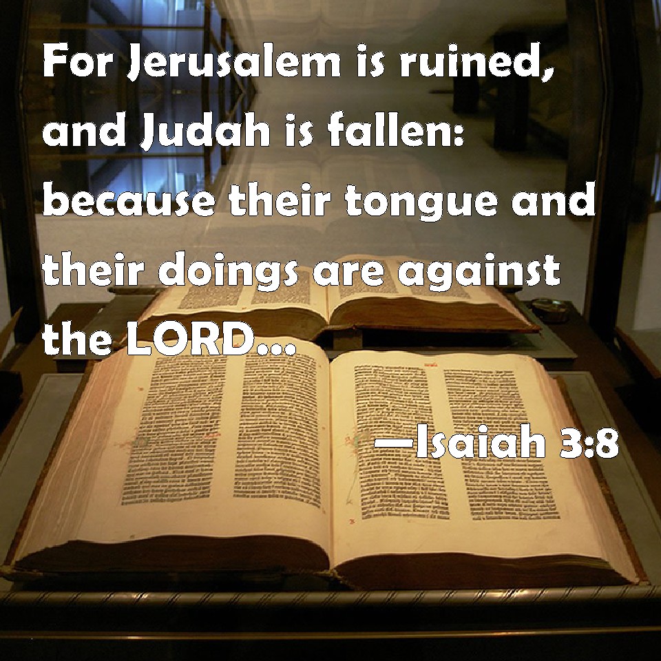 Choose a Background Isaiah 3:8 For Jerusalem is ruined, and Judah is fallen: because their tongue and their doings are against the LORD, to provoke the eyes of his glory. KJV: For Jerusalem is ruined, and Judah is fallen: because their tongue and their doings are against the LORD, to provoke the eyes of his glory. DRB: For Jerusalem is ruined, and Juda is fallen: because their tongue, and their devices are against the Lord, to provoke the eyes of his majesty. DBT: For Jerusalem stumbleth and Judah falleth, because their tongue and their doings are against Jehovah, to provoke the eyes of his glory. ERV: For Jerusalem is ruined, and Judah is fallen: because their tongue and their doings are against the LORD, to provoke the eyes of his glory. WBT: For Jerusalem is ruined, and Judah is fallen: because their tongue and their doings are against the LORD, to provoke the eyes of his glory. WEB: For Jerusalem is ruined, and Judah is fallen; because their tongue and their doings are against Yahweh, to provoke the eyes of his glory. YLT: For stumbled hath Jerusalem, and Judah hath fallen, For their tongue and their doings are against Jehovah, To provoke the eyes of His glory.Links Isaiah 3:8 NIV • Isaiah 3:8 NLT • Isaiah 3:8 ESV • Isaiah 3:8 NASB • Isaiah 3:8 KJV • Isaiah 3:8 Interlinear • Isaiah 3:8 Commentaries • Isaiah 3:8 Parallel Texts • Isaiah 3:8 Bible Apps • Isaiah 3:8 Parallel • Bible Hub |