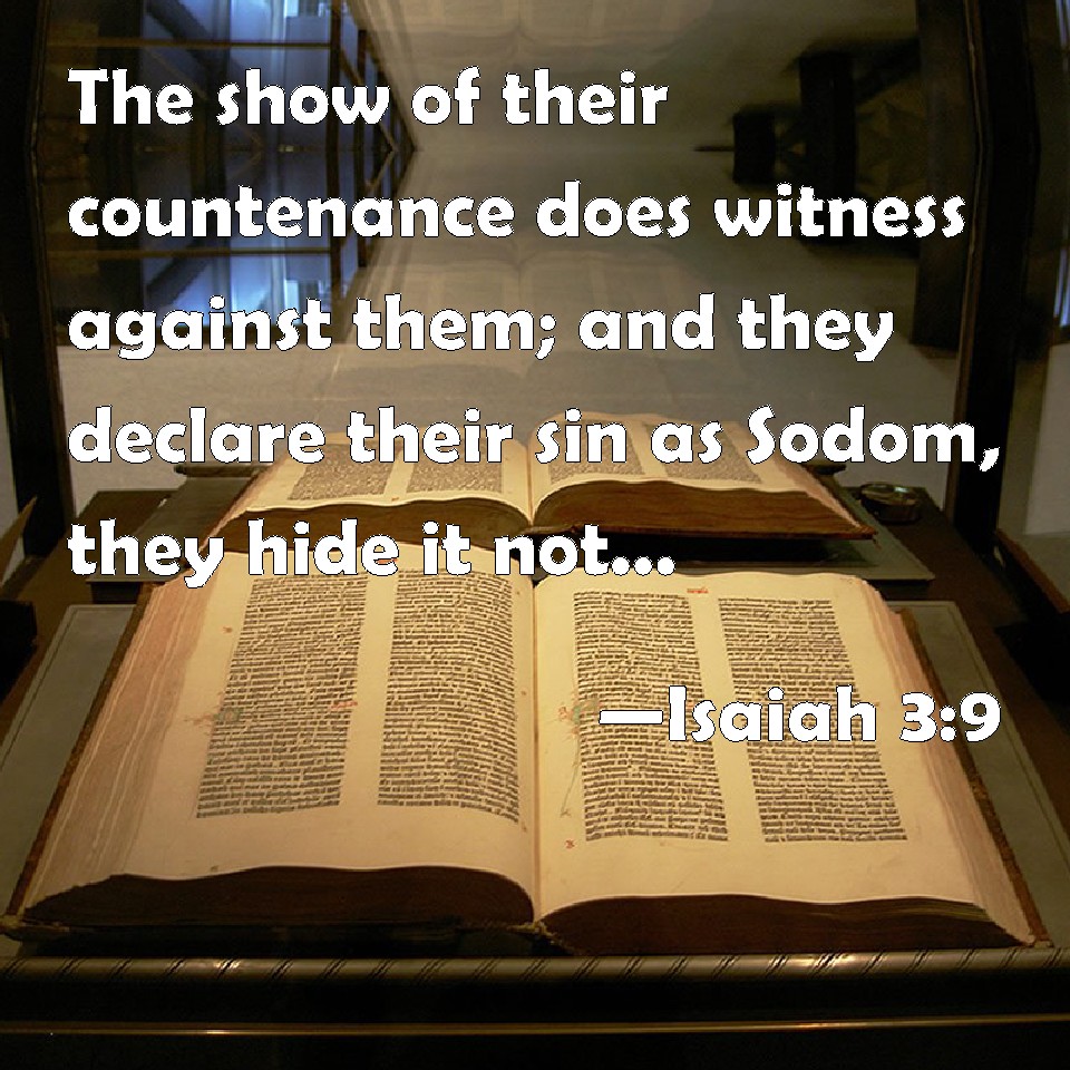 Choose a Background Isaiah 3:9 The show of their countenance does witness against them; and they declare their sin as Sodom, they hide it not. Woe to their soul! for they have rewarded evil to themselves. KJV: The shew of their countenance doth witness against them; and they declare their sin as Sodom, they hide it not. Woe unto their soul! for they have rewarded evil unto themselves. DRB: The shew of their countenance hath answered them: and they have proclaimed abroad their sin as Sodom, and they have not hid it: woe to their souls, for evils are rendered to them. DBT: The look of their face doth witness against them, and they declare their sin as Sodom: they hide it not. Woe unto their soul! for they have brought evil upon themselves. ERV: The shew of their countenance doth witness against them; and they declare their sin as Sodom, they hide it not. Woe unto their soul! for they have rewarded evil unto themselves. WBT: The show of their countenance doth witness against them; and they declare their sin as Sodom, they hide it not. Woe to their soul! for they have rewarded evil to themselves. WEB: The look of their faces testify against them. They parade their sin like Sodom. They don't hide it. Woe to their soul! For they have brought disaster upon themselves. YLT: The appearance of their faces witnessed against them, And their sin, as Sodom, they declared, They have not hidden! Woe to their soul, For they have done to themselves evil.Links Isaiah 3:9 NIV • Isaiah 3:9 NLT • Isaiah 3:9 ESV • Isaiah 3:9 NASB • Isaiah 3:9 KJV • Isaiah 3:9 Interlinear • Isaiah 3:9 Commentaries • Isaiah 3:9 Parallel Texts • Isaiah 3:9 Bible Apps • Isaiah 3:9 Parallel • Bible Hub |