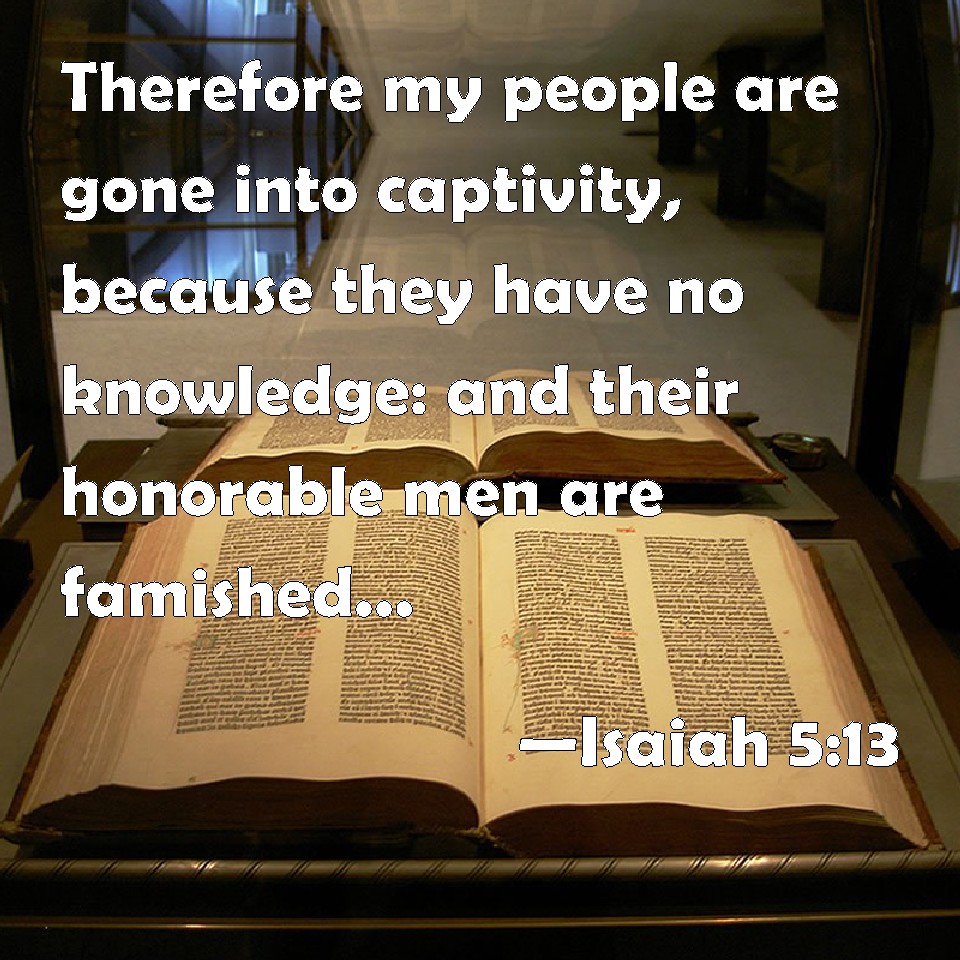 Choose a Background Isaiah 5:13 Therefore my people are gone into captivity, because they have no knowledge: and their honorable men are famished, and their multitude dried up with thirst. KJV: Therefore my people are gone into captivity, because they have no knowledge: and their honourable men are famished, and their multitude dried up with thirst. DRB: Therefore is my people led away captive, because they had not knowledge, and their nobles have perished with famine, and their multitude were dried up with thirst. DBT: Therefore my people are led away captive from lack of knowledge, and their nobility die of famine, and their multitude are parched with thirst. ERV: Therefore my people are gone into captivity, for lack of knowledge: and their honourable men are famished, and their multitude are parched with thirst. WBT: Therefore my people have gone into captivity, because they have no knowledge: and their honorable men are famished, and their multitude dried up with thirst. WEB: Therefore my people go into captivity for lack of knowledge. Their honorable men are famished, and their multitudes are parched with thirst. YLT: Therefore my people removed without knowledge, And its honourable ones are famished, And its multitude dried up of thirst.Links Isaiah 5:13 NIV • Isaiah 5:13 NLT • Isaiah 5:13 ESV • Isaiah 5:13 NASB • Isaiah 5:13 KJV • Isaiah 5:13 Interlinear • Isaiah 5:13 Commentaries • Isaiah 5:13 Parallel Texts • Isaiah 5:13 Bible Apps • Isaiah 5:13 Parallel • Bible Hub |