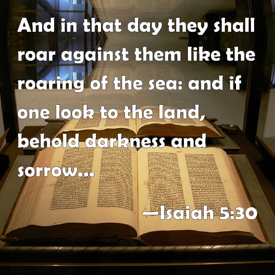 Choose a Background Isaiah 5:30 And in that day they shall roar against them like the roaring of the sea: and if one look to the land, behold darkness and sorrow, and the light is darkened in the heavens thereof. KJV: And in that day they shall roar against them like the roaring of the sea: and if one look unto the land, behold darkness and sorrow, and the light is darkened in the heavens thereof. DRB: And they shall make a noise against them that day, like the roaring of the sea; we shall look towards the land, and behold darkness of tribulation, and the light is darkened with the mist thereof. DBT: and they shall roar against them in that day like the roaring of the sea. And if one look upon the earth, behold darkness and distress, and the light is darkened in the heavens thereof. ERV: And they shall roar against them in that day like the roaring of the sea: and if one look unto the land, behold darkness and distress, and the light is darkened in the clouds thereof. WBT: And in that day they shall roar against them like the roaring of the sea: and if one looketh to the land, behold darkness and sorrow, and the light is darkened in its heavens. WEB: They will roar against them in that day like the roaring of the sea. If one looks to the land behold, darkness and distress. The light is darkened in its clouds. YLT: And it howleth against it in that day as the howling of a sea, And it hath looked attentively to the land, And lo, darkness — distress, And light hath been darkened by its abundance!Links Isaiah 5:30 NIV • Isaiah 5:30 NLT • Isaiah 5:30 ESV • Isaiah 5:30 NASB • Isaiah 5:30 KJV • Isaiah 5:30 Interlinear • Isaiah 5:30 Commentaries • Isaiah 5:30 Parallel Texts • Isaiah 5:30 Bible Apps • Isaiah 5:30 Parallel • Bible Hub |