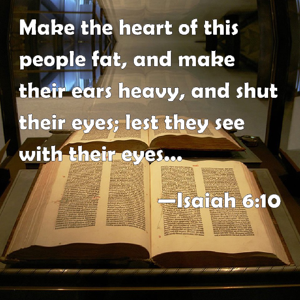 Choose a Background Isaiah 6:10 Make the heart of this people fat, and make their ears heavy, and shut their eyes; lest they see with their eyes, and hear with their ears, and understand with their heart, and convert, and be healed. KJV: Make the heart of this people fat, and make their ears heavy, and shut their eyes; lest they see with their eyes, and hear with their ears, and understand with their heart, and convert, and be healed. DRB: Blind the heart of this people, and make their ears heavy, and shut their eyes: lest they see with their eyes, and hear with their ears, and understand with their heart, and be converted and I heal them. DBT: Make the heart of this people fat, and make their ears heavy, and blind their eyes; lest they see with their eyes, and hear with their ears, and understand with their heart, and be converted, and healed. ERV: Make the heart of this people fat, and make their ears heavy, and shut their eyes; lest they see with their eyes, and hear with their ears, and understand with their heart, and turn again, and be healed. WBT: Make the heart of this people fat, and make their ears heavy, and shut their eyes; lest they see with their eyes, and hear with their ears, and understand with their heart, and convert, and be healed. WEB: Make the heart of this people fat. Make their ears heavy, and shut their eyes; lest they see with their eyes, and hear with their ears, and understand with their heart, and turn again, and be healed." YLT: Declare fat the heart of this people, And its ears declare heavy, And its eyes declare dazzled, Lest it see with its eyes, And with its ears hear, and its heart consider, And it hath turned back, and hath health.'Links Isaiah 6:10 NIV • Isaiah 6:10 NLT • Isaiah 6:10 ESV • Isaiah 6:10 NASB • Isaiah 6:10 KJV • Isaiah 6:10 Interlinear • Isaiah 6:10 Commentaries • Isaiah 6:10 Parallel Texts • Isaiah 6:10 Bible Apps • Isaiah 6:10 Parallel • Bible Hub |