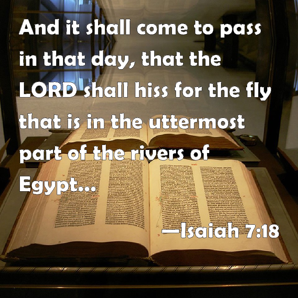 Choose a Background Isaiah 7:18 And it shall come to pass in that day, that the LORD shall hiss for the fly that is in the uttermost part of the rivers of Egypt, and for the bee that is in the land of Assyria. KJV: And it shall come to pass in that day, that the LORD shall hiss for the fly that is in the uttermost part of the rivers of Egypt, and for the bee that is in the land of Assyria. DRB: And it shall come to pass in that day, that the Lord shall hiss for the fly, that is in the uttermost parts of the rivers of Egypt, and for the bee that is in the land of Assyria. DBT: And it shall come to pass in that day, that Jehovah will hiss for the fly which is at the extremity of the streams of Egypt, and for the bee which is in the land of Assyria; ERV: And it shall come to pass in that day, that the LORD shall hiss for the fly that is in the uttermost part of the rivers of Egypt, and for the bee that is in the land of Assyria. WBT: And it shall come to pass in that day, that the LORD will hiss for the fly that is in the uttermost part of the rivers of Egypt, and for the bee that is in the land of Assyria. WEB: It will happen in that day that Yahweh will whistle for the fly that is in the uttermost part of the rivers of Egypt, and for the bee that is in the land of Assyria. YLT: And it hath come to pass, in that day, Jehovah doth hiss for a fly that is in the extremity of the brooks of Egypt, And for a bee that is in the land of Asshur.Links Isaiah 7:18 NIV • Isaiah 7:18 NLT • Isaiah 7:18 ESV • Isaiah 7:18 NASB • Isaiah 7:18 KJV • Isaiah 7:18 Interlinear • Isaiah 7:18 Commentaries • Isaiah 7:18 Parallel Texts • Isaiah 7:18 Bible Apps • Isaiah 7:18 Parallel • Bible Hub |