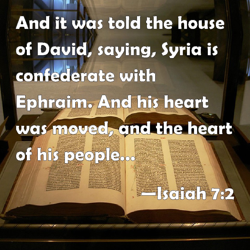 Choose a Background Isaiah 7:2 And it was told the house of David, saying, Syria is confederate with Ephraim. And his heart was moved, and the heart of his people, as the trees of the wood are moved with the wind. KJV: And it was told the house of David, saying, Syria is confederate with Ephraim. And his heart was moved, and the heart of his people, as the trees of the wood are moved with the wind. DRB: And they told the house of David, saying: Syria hath rested upon Ephraim, and his heart was moved, and the heart of his people, as the trees of the woods are moved with the wind. DBT: And it was told the house of David saying, Syria is allied with Ephraim. Then his heart and the heart of his people shook, as the trees of the forest are shaken with the wind. ERV: And it was told the house of David, saying, Syria is confederate with Ephraim. And his heart was moved, and the heart of his people, as the trees of the forest are moved with the wind. WBT: And it was told the house of David, saying, Syria is confederate with Ephraim. And his heart was moved, and the heart of his people, as the trees of the wood are moved with the wind. WEB: It was told the house of David, saying, "Syria is allied with Ephraim." His heart trembled, and the heart of his people, as the trees of the forest tremble with the wind. YLT: And it is declared to the house of David, saying, 'Aram hath been led towards Ephraim,' And his heart and the heart of his people is moved, like the moving of trees of a forest by the presence of wind.Links Isaiah 7:2 NIV • Isaiah 7:2 NLT • Isaiah 7:2 ESV • Isaiah 7:2 NASB • Isaiah 7:2 KJV • Isaiah 7:2 Interlinear • Isaiah 7:2 Commentaries • Isaiah 7:2 Parallel Texts • Isaiah 7:2 Bible Apps • Isaiah 7:2 Parallel • Bible Hub |