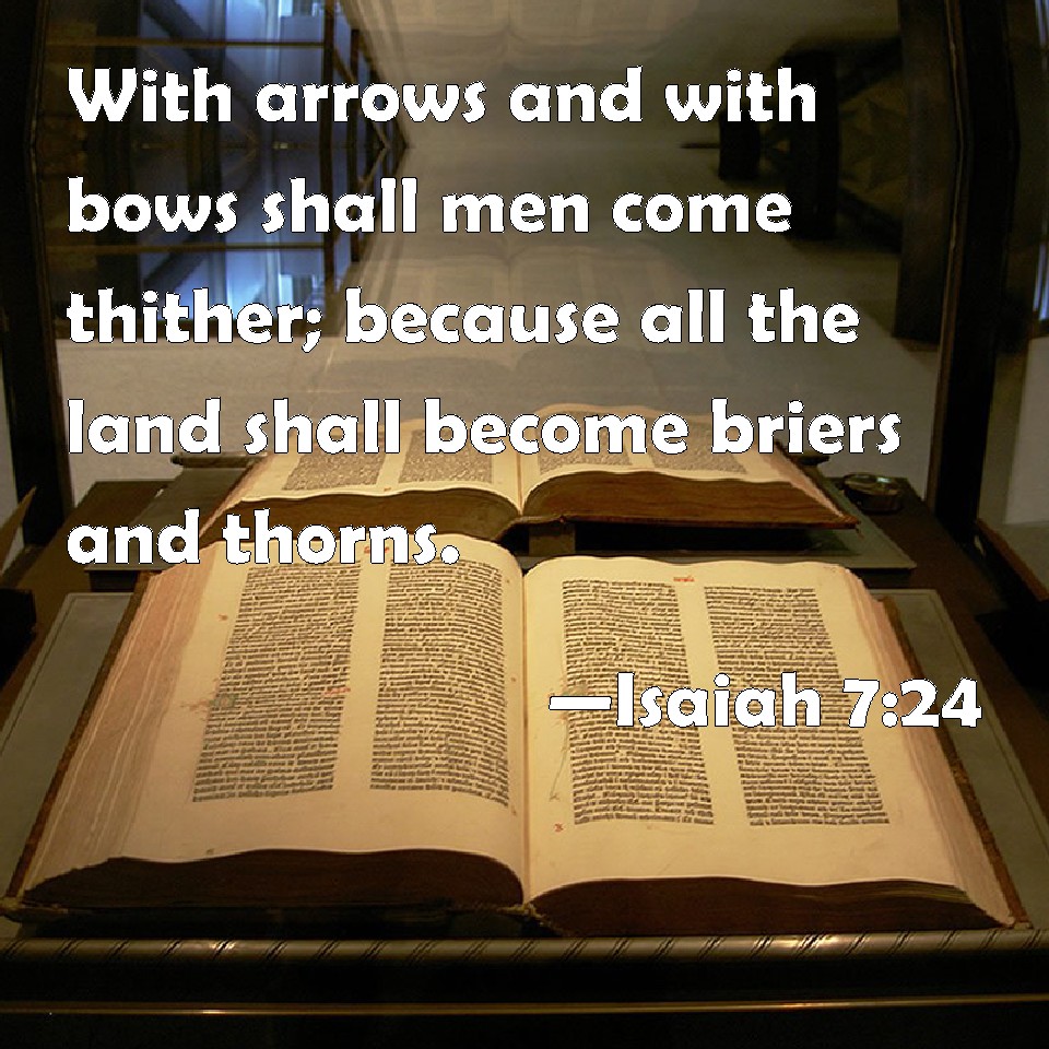 Isaiah 7:24 With arrows and with bows shall men come thither; because all the land shall become briers and thorns.