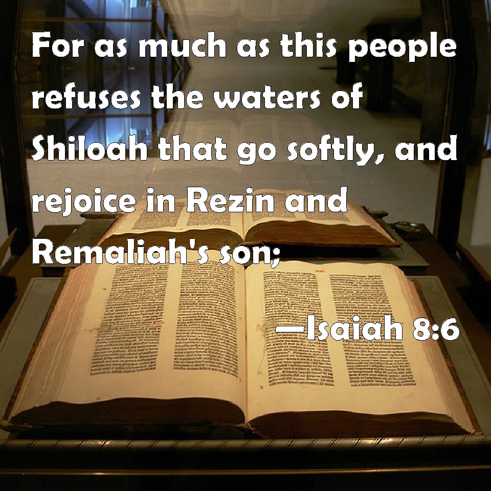 Choose a Background Isaiah 8:6 For as much as this people refuses the waters of Shiloah that go softly, and rejoice in Rezin and Remaliah's son; KJV: Forasmuch as this people refuseth the waters of Shiloah that go softly, and rejoice in Rezin and Remaliah's son; DRB: Forasmuch as this people hath cast away the waters of Siloe, that go with silence, and hath rather taken Basin, and the son of Romelia: DBT: Forasmuch as this people refuseth the waters of Shiloah which flow softly, and rejoiceth in Rezin and in the son of Remaliah, ERV: Forasmuch as this people hath refused the waters of Shiloah that go softly, and rejoice in Rezin and Remaliah's son; WBT: Forasmuch as this people refuseth the waters of Shiloah that flow gently, and rejoice in Rezin and Remaliah's son; WEB: "Because this people have refused the waters of Shiloah that go softly, and rejoice in Rezin and Remaliah's son; YLT: 'Because that this people hath refused The waters of Shiloah that go softly, And is rejoicing with Rezin and the son of Remaliah,Links Isaiah 8:6 NIV • Isaiah 8:6 NLT • Isaiah 8:6 ESV • Isaiah 8:6 NASB • Isaiah 8:6 KJV • Isaiah 8:6 Interlinear • Isaiah 8:6 Commentaries • Isaiah 8:6 Parallel Texts • Isaiah 8:6 Bible Apps • Isaiah 8:6 Parallel • Bible Hub |