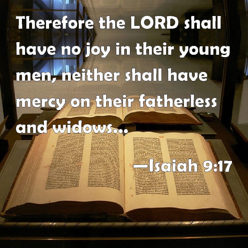 Choose a Background Isaiah 9:17 Therefore the LORD shall have no joy in their young men, neither shall have mercy on their fatherless and widows: for every one is an hypocrite and an evildoer, and every mouth speaks folly. For all this his anger is not turned away, but his hand is stretched out still. KJV: Therefore the Lord shall have no joy in their young men, neither shall have mercy on their fatherless and widows: for every one is an hypocrite and an evildoer, and every mouth speaketh folly. For all this his anger is not turned away, but his hand is stretched out still. DRB: Therefore the Lord shell have no joy in their young men: neither shall he have mercy on their fatherless, and widows: for every one is a hypocrite and wicked, and every mouth hath spoken folly. For all this his indignation is not turned away, but his bend is stretched out still. DBT: Therefore the Lord will not rejoice in their young men, neither will he have mercy on their fatherless and on their widows; for every one is a hypocrite and an evildoer, and every mouth speaketh folly. For all this his anger is not turned away, and his hand is stretched out still. ERV: Therefore the Lord shall not rejoice over their young men, neither shall he have compassion on their fatherless and widows: for every one is profane and an evil-doer, and every mouth speaketh folly. For all this his anger is not turned away, but his hand is stretched out still. WBT: Therefore the Lord will have no joy in their young men, neither will have mercy on their fatherless and widows: for every one is a hypocrite and an evil-doer, and every mouth speaketh folly. For all this his anger is not turned away, but his hand is stretched out still. WEB: Therefore the Lord will not rejoice over their young men, neither will he have compassion on their fatherless and widows; for everyone is profane and an evildoer, and every mouth speaks folly. For all this his anger is not turned away, but his hand is stretched out still. YLT: Therefore, over its young men the Lord rejoiceth not, And its orphans, and its widows He pitieth not, For every one is profane, and an evil doer, And every mouth is speaking folly. With all this not turned back hath His anger, And still His hand is stretched out.Links Isaiah 9:17 NIV • Isaiah 9:17 NLT • Isaiah 9:17 ESV • Isaiah 9:17 NASB • Isaiah 9:17 KJV • Isaiah 9:17 Interlinear • Isaiah 9:17 Commentaries • Isaiah 9:17 Parallel Texts • Isaiah 9:17 Bible Apps • Isaiah 9:17 Parallel • Bible Hub |
