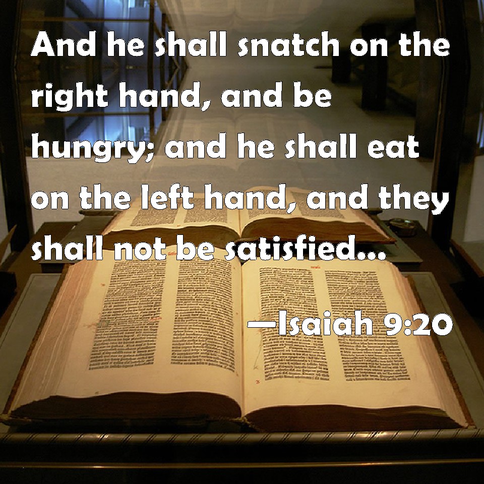 Choose a Background Isaiah 9:20 And he shall snatch on the right hand, and be hungry; and he shall eat on the left hand, and they shall not be satisfied: they shall eat every man the flesh of his own arm: KJV: And he shall snatch on the right hand, and be hungry; and he shall eat on the left hand, and they shall not be satisfied: they shall eat every man the flesh of his own arm: DRB: And he shall turn to the right hand, and shall be hungry: and shall eat on the left hand, and shall not be filled: every one shell eat the flesh of his own arm: Manasses Ephraim, and Ephraim Manasses, and they together shall be against Juda. DBT: and he snatcheth on the right hand, and is hungry, and eateth on the left hand; and they are not satisfied. They eat every man the flesh of his own arm: ERV: And one shall snatch on the right hand, and be hungry; and he shall eat on the left hand, and they shall not be satisfied: they shall eat every man the flesh of his own arm: WBT: And he shall snatch on the right hand, and be hungry; and he shall eat on the left hand, and they shall not be satisfied: they shall eat every man the flesh of his own arm: WEB: One will devour on the right hand, and be hungry; and he will eat on the left hand, and they will not be satisfied. Everyone will eat the flesh of his own arm: YLT: And cutteth down on the right, and hath been hungry, And he devoureth on the left, And they have not been satisfied, Each the flesh of his own arm they devour.Links Isaiah 9:20 NIV • Isaiah 9:20 NLT • Isaiah 9:20 ESV • Isaiah 9:20 NASB • Isaiah 9:20 KJV • Isaiah 9:20 Interlinear • Isaiah 9:20 Commentaries • Isaiah 9:20 Parallel Texts • Isaiah 9:20 Bible Apps • Isaiah 9:20 Parallel • Bible Hub |
