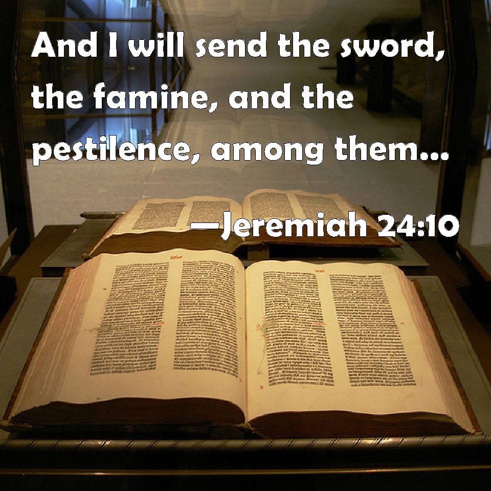 Choose a Background Jeremiah 24:10 And I will send the sword, the famine, and the pestilence, among them, till they be consumed from off the land that I gave to them and to their fathers. KJV: And I will send the sword, the famine, and the pestilence, among them, till they be consumed from off the land that I gave unto them and to their fathers. DRB: And I will send among them the sword, and the famine, and the pestilence: till they be consumed out of the land which I gave to them, and their fathers. DBT: and I will send among them the sword, the famine, and the pestilence, until they be consumed from off the land that I gave unto them and to their fathers. ERV: And I will send the sword, the famine, and the pestilence, among them, till they be consumed from off the land that I gave unto them and to their fathers. WBT: And I will send the sword, the famine, and the pestilence, among them, till they are consumed from off the land that I gave to them and to their fathers. WEB: I will send the sword, the famine, and the pestilence, among them, until they be consumed from off the land that I gave to them and to their fathers. YLT: And I have sent against them the sword, The famine and the pestilence, Till their consumption from off the ground, That I gave to them and to their fathers!Links Jeremiah 24:10 NIV • Jeremiah 24:10 NLT • Jeremiah 24:10 ESV • Jeremiah 24:10 NASB • Jeremiah 24:10 KJV • Jeremiah 24:10 Interlinear • Jeremiah 24:10 Commentaries • Jeremiah 24:10 Parallel Texts • Jeremiah 24:10 Bible Apps • Jeremiah 24:10 Parallel • Bible Hub |