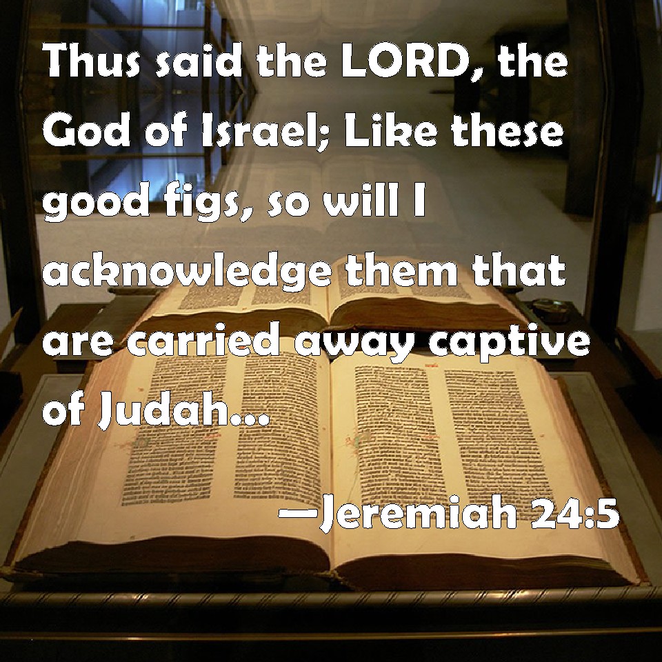 Choose a Background Jeremiah 24:5 Thus said the LORD, the God of Israel; Like these good figs, so will I acknowledge them that are carried away captive of Judah, whom I have sent out of this place into the land of the Chaldeans for their good. KJV: Thus saith the LORD, the God of Israel; Like these good figs, so will I acknowledge them that are carried away captive of Judah, whom I have sent out of this place into the land of the Chaldeans for their good. DRB: Thus saith the Lord the God of Israel: Like these good figs, so will I regard the captives of Juda, whom I have sent forth out of this place into the land oif the Chaldeans, for their own good. DBT: Thus saith Jehovah, the God of Israel: Like these good figs, so will I regard for good them that are carried away captive of Judah, whom I have sent out of this place into the land of the Chaldeans; ERV: Thus saith the LORD, the God of Israel; Like these good figs, so will I regard the captives of Judah, whom I have sent out of this place into the land of the Chaldeans, for good. WBT: Thus saith the LORD, the God of Israel; Like these good figs, so will I acknowledge them that are carried away captive of Judah, whom I have sent out of this place into the land of the Chaldeans for their good. WEB: Thus says Yahweh, the God of Israel: Like these good figs, so will I regard the captives of Judah, whom I have sent out of this place into the land of the Chaldeans, for good. YLT: Thus said Jehovah, God of Israel, Like these good figs so do I acknowledge The removed of Judah — that I sent from this place, To the land of the Chaldeans — for good.Links Jeremiah 24:5 NIV • Jeremiah 24:5 NLT • Jeremiah 24:5 ESV • Jeremiah 24:5 NASB • Jeremiah 24:5 KJV • Jeremiah 24:5 Interlinear • Jeremiah 24:5 Commentaries • Jeremiah 24:5 Parallel Texts • Jeremiah 24:5 Bible Apps • Jeremiah 24:5 Parallel • Bible Hub |
