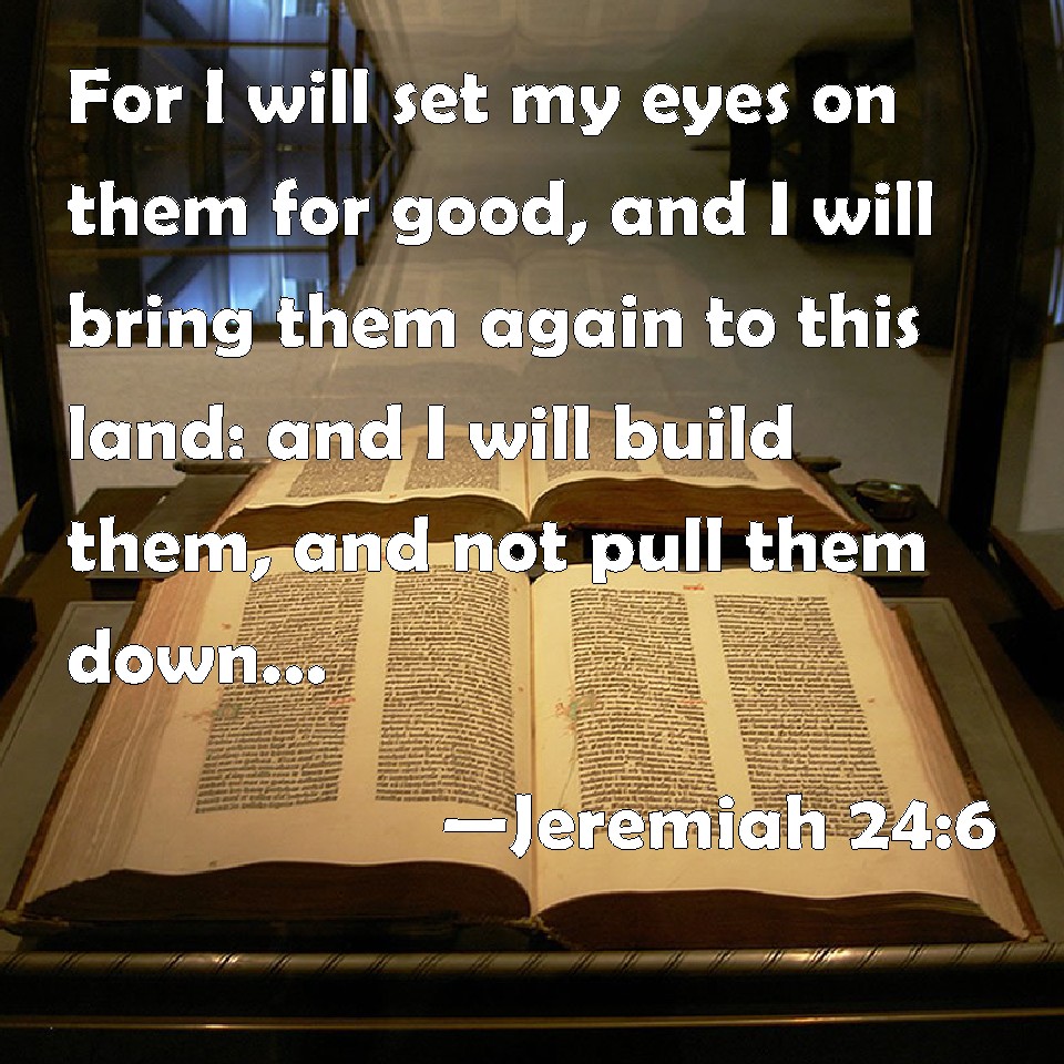 Choose a Background Jeremiah 24:6 For I will set my eyes on them for good, and I will bring them again to this land: and I will build them, and not pull them down; and I will plant them, and not pluck them up. KJV: For I will set mine eyes upon them for good, and I will bring them again to this land: and I will build them, and not pull them down; and I will plant them, and not pluck them up. DRB: And I will set my eyes upon them to be pacified, and I will bring them again into this land: and I will be their God: and I will build them up, and not pull them down: and I will plant them, and not pluck them up. DBT: and I will set mine eyes upon them for good, and I will bring them again to this land; and I will build them and not pull them down, and I will plant them and not pluck them up. ERV: For I will set mine eyes upon them for good, and I will bring them again to this land: and I will build them, and not pull them down; and I will plant them, and not pluck them up. WBT: For I will set my eyes upon them for good, and I will bring them again to this land: and I will build them, and not pull them down; and I will plant them, and not pluck them up. WEB: For I will set my eyes on them for good, and I will bring them again to this land: and I will build them, and not pull them down; and I will plant them, and not pluck them up. YLT: And I have set Mine eyes on them for good, And have brought them back to this land, And built them up, and I throw not down, And have planted them, and pluck not up.Links Jeremiah 24:6 NIV • Jeremiah 24:6 NLT • Jeremiah 24:6 ESV • Jeremiah 24:6 NASB • Jeremiah 24:6 KJV • Jeremiah 24:6 Interlinear • Jeremiah 24:6 Commentaries • Jeremiah 24:6 Parallel Texts • Jeremiah 24:6 Bible Apps • Jeremiah 24:6 Parallel • Bible Hub |