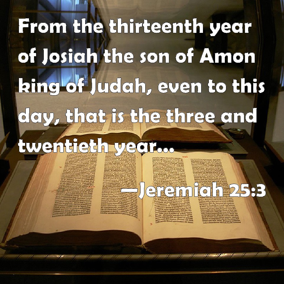 Choose a Background Jeremiah 25:3 From the thirteenth year of Josiah the son of Amon king of Judah, even to this day, that is the three and twentieth year, the word of the LORD has come to me, and I have spoken to you, rising early and speaking; but you have not listened. KJV: From the thirteenth year of Josiah the son of Amon king of Judah, even unto this day, that is the three and twentieth year, the word of the LORD hath come unto me, and I have spoken unto you, rising early and speaking; but ye have not hearkened. DRB: From the thirteenth year of Josias the son of Ammon king of Juda until this day: this is the three and twentieth year, the word of the Lord hath come to me, and I have spoken to you, rising before day, and speaking, and you have not hearkened. DBT: From the thirteenth year of Josiah the son of Amon, the king of Judah, even unto this day, these three and twenty years, the word of Jehovah hath come unto me, and I have spoken unto you, rising early and speaking; but ye have not hearkened. ERV: From the thirteenth year of Josiah the son of Amon, king of Judah, even unto this day, these three and twenty years, the word of the LORD hath come unto me, and I have spoken unto you, rising up early and speaking; but ye have not hearkened. WBT: From the thirteenth year of Josiah the son of Amon king of Judah, even to this day, that is the three and twentieth year, the word of the LORD hath come to me, and I have spoken to you, rising early and speaking; but ye have not hearkened. WEB: From the thirteenth year of Josiah the son of Amon, king of Judah, even to this day, these twenty-three years, the word of Yahweh has come to me, and I have spoken to you, rising up early and speaking; but you have not listened. YLT: From the thirteenth year of Josiah son of Amon king of Judah, and unto this day — this three and twentieth year — hath the word of Jehovah been unto me, and I speak unto you, rising early and speaking, and ye have not hearkened;Links Jeremiah 25:3 NIV • Jeremiah 25:3 NLT • Jeremiah 25:3 ESV • Jeremiah 25:3 NASB • Jeremiah 25:3 KJV • Jeremiah 25:3 Interlinear • Jeremiah 25:3 Commentaries • Jeremiah 25:3 Parallel Texts • Jeremiah 25:3 Bible Apps • Jeremiah 25:3 Parallel • Bible Hub |