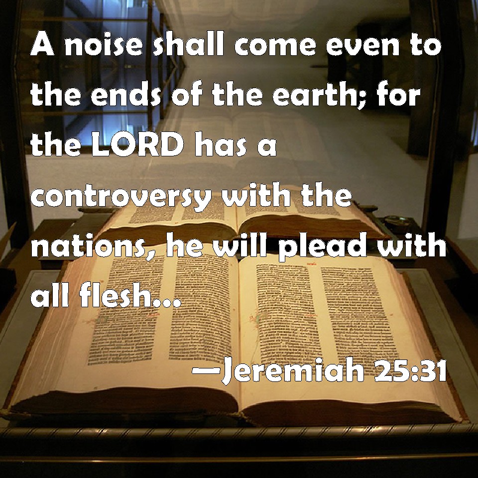 Choose a Background Jeremiah 25:31 A noise shall come even to the ends of the earth; for the LORD has a controversy with the nations, he will plead with all flesh; he will give them that are wicked to the sword, said the LORD. KJV: A noise shall come even to the ends of the earth; for the LORD hath a controversy with the nations, he will plead with all flesh; he will give them that are wicked to the sword, saith the LORD. DRB: The noise is come even to the ends of the earth: for the Lord entereth into judgement with the nations: he entereth into judgement with all flesh; the wicked I have delivered up to the sword, saith the Lord. DBT: The noise shall come to the end of the earth: for Jehovah hath a controversy with the nations, he entereth into judgment with all flesh; as for the wicked, he will give them up to the sword, saith Jehovah. ERV: A noise shall come even to the end of the earth; for the LORD hath a controversy with the nations, he will plead with all flesh; as for the wicked, he will give them to the sword, saith the LORD. WBT: A noise shall come even to the ends of the earth; for the LORD hath a controversy with the nations, he will plead with all flesh; he will give them that are wicked to the sword, saith the LORD. WEB: A noise shall come even to the end of the earth; for Yahweh has a controversy with the nations; he will enter into judgment with all flesh: as for the wicked, he will give them to the sword, says Yahweh. YLT: Wasting hath come unto the end of the earth, For a controversy hath Jehovah with nations, He hath executed judgment for all flesh, The wicked! He hath given them to the sword, An affirmation of Jehovah.Links Jeremiah 25:31 NIV • Jeremiah 25:31 NLT • Jeremiah 25:31 ESV • Jeremiah 25:31 NASB • Jeremiah 25:31 KJV • Jeremiah 25:31 Interlinear • Jeremiah 25:31 Commentaries • Jeremiah 25:31 Parallel Texts • Jeremiah 25:31 Bible Apps • Jeremiah 25:31 Parallel • Bible Hub |