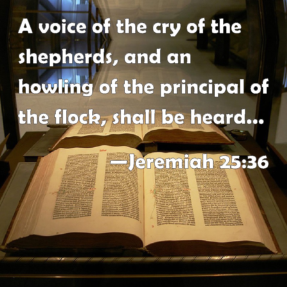 Choose a Background Jeremiah 25:36 A voice of the cry of the shepherds, and an howling of the principal of the flock, shall be heard: for the LORD has spoiled their pasture. KJV: A voice of the cry of the shepherds, and an howling of the principal of the flock, shall be heard: for the LORD hath spoiled their pasture. DRB: A voice of the cry of the shepherds, and a howling of the principal of the flock: because the Lord hath watsed their pastures. DBT: There shall be a voice of the cry of the shepherds, and a howling of the noble ones of the flock: for Jehovah layeth waste their pasture; ERV: A voice of the cry of the shepherds, and the howling of the principal of the flock! for the LORD layeth waste their pasture. WBT: A voice of the cry of the shepherds, and a howling of the principal of the flock, shall be heard: for the LORD hath laid waste their pasture. WEB: A voice of the cry of the shepherds, and the wailing of the principal of the flock! for Yahweh lays waste their pasture. YLT: A voice is of the cry of the shepherds, And a howling of the honourable of the flock, For Jehovah is spoiling their pasture.Links Jeremiah 25:36 NIV • Jeremiah 25:36 NLT • Jeremiah 25:36 ESV • Jeremiah 25:36 NASB • Jeremiah 25:36 KJV • Jeremiah 25:36 Interlinear • Jeremiah 25:36 Commentaries • Jeremiah 25:36 Parallel Texts • Jeremiah 25:36 Bible Apps • Jeremiah 25:36 Parallel • Bible Hub |