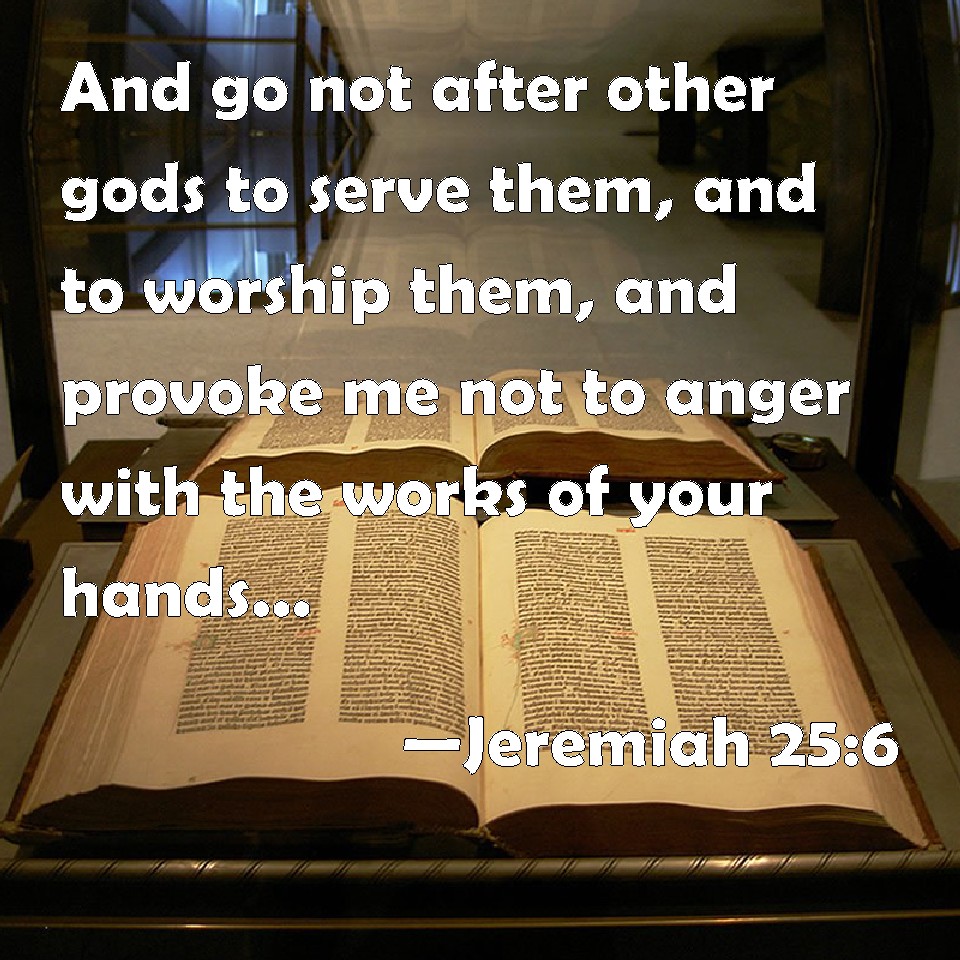 Choose a Background Jeremiah 25:6 And go not after other gods to serve them, and to worship them, and provoke me not to anger with the works of your hands; and I will do you no hurt. KJV: And go not after other gods to serve them, and to worship them, and provoke me not to anger with the works of your hands; and I will do you no hurt. DRB: And go not after strange gods to serve them, and adore them: nor provoke me to wrath by the works of your hands, and I will not afflict you. DBT: And go not after other gods, to serve them and to worship them; and provoke me not to anger with the work of your hands; and I will do you no hurt. ERV: and go not after other gods to serve them, and to worship them, and provoke me not to anger with the work of your hands; and I will do you no hurt. WBT: And go not after other gods to serve them, and to worship them, and provoke me not to anger with the works of your hands; and I will do you no hurt. WEB: and don't go after other gods to serve them or worship them, and don't provoke me to anger with the work of your hands; and I will do you no harm. YLT: And ye do not go after other gods to serve them, and to bow yourselves to them, nor do ye provoke Me to anger with the work of your hands, and I do no evil to you;Links Jeremiah 25:6 NIV • Jeremiah 25:6 NLT • Jeremiah 25:6 ESV • Jeremiah 25:6 NASB • Jeremiah 25:6 KJV • Jeremiah 25:6 Interlinear • Jeremiah 25:6 Commentaries • Jeremiah 25:6 Parallel Texts • Jeremiah 25:6 Bible Apps • Jeremiah 25:6 Parallel • Bible Hub |