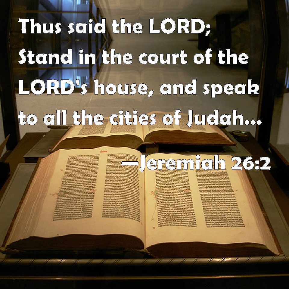 Choose a Background Jeremiah 26:2 Thus said the LORD; Stand in the court of the LORD's house, and speak to all the cities of Judah, which come to worship in the LORD's house, all the words that I command you to speak to them; diminish not a word: KJV: Thus saith the LORD; Stand in the court of the LORD'S house, and speak unto all the cities of Judah, which come to worship in the LORD'S house, all the words that I command thee to speak unto them; diminish not a word: DRB: Thus saith the Lord: Stand in the court of the house of the Lord, and speak to all the cities of Juda, out of which they come, to adore in the house of the Lord, all the words which I have commanded thee to to speak unto them: leave not out one word. DBT: Thus saith Jehovah: Stand in the court of Jehovah's house, and speak unto all the cities of Judah, which come to worship in Jehovah's house, all the words that I command thee to speak unto them: diminish not a word. ERV: Thus saith the LORD: Stand in the court of the LORD'S house, and speak unto all the cities of Judah, which come to worship in the LORD'S house, all the words that I command thee to speak unto them; keep not back a word. WBT: Thus saith the LORD; Stand in the court of the LORD'S house, and speak to all the cities of Judah, which come to worship in the LORD'S house, all the words that I command thee to speak to them; diminish not a word: WEB: Thus says Yahweh: Stand in the court of Yahweh's house, and speak to all the cities of Judah, which come to worship in Yahweh's house, all the words that I command you to speak to them; don't diminish a word. YLT: Thus said Jehovah, Stand thou in the court of the house of Jehovah, and thou hast spoken unto all those of the cities of Judah who are coming in to bow themselves in the house of Jehovah, all the words that I have commanded thee to speak unto them, thou dost not diminish a word.Links Jeremiah 26:2 NIV • Jeremiah 26:2 NLT • Jeremiah 26:2 ESV • Jeremiah 26:2 NASB • Jeremiah 26:2 KJV • Jeremiah 26:2 Interlinear • Jeremiah 26:2 Commentaries • Jeremiah 26:2 Parallel Texts • Jeremiah 26:2 Bible Apps • Jeremiah 26:2 Parallel • Bible Hub |