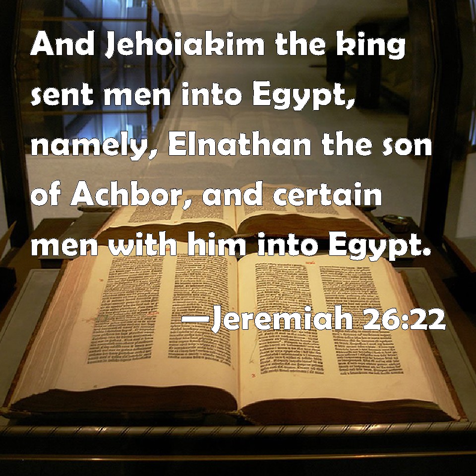 Choose a Background Jeremiah 26:22 And Jehoiakim the king sent men into Egypt, namely, Elnathan the son of Achbor, and certain men with him into Egypt. KJV: And Jehoiakim the king sent men into Egypt, namely, Elnathan the son of Achbor, and certain men with him into Egypt. DRB: And king Joakim sent men into Egypt, Elnathan the son of Achobor, and men with him into Egypt. DBT: And Jehoiakim the king sent men into Egypt, Elnathan the son of Achbor, and men with him, into Egypt; ERV: and Jehoiakim the king sent men into Egypt, namely, Elnathan the son of Achbor, and certain men with him, into Egypt: WBT: And Jehoiakim the king sent men into Egypt, namely, Elnathan the son of Achbor, and certain men with him into Egypt. WEB: and Jehoiakim the king sent men into Egypt, [namely], Elnathan the son of Achbor, and certain men with him, into Egypt; YLT: And the king Jehoiakim sendeth men to Egypt — Elnathan son of Achbor, and men with him unto Egypt — Links Jeremiah 26:22 NIV • Jeremiah 26:22 NLT • Jeremiah 26:22 ESV • Jeremiah 26:22 NASB • Jeremiah 26:22 KJV • Jeremiah 26:22 Interlinear • Jeremiah 26:22 Commentaries • Jeremiah 26:22 Parallel Texts • Jeremiah 26:22 Bible Apps • Jeremiah 26:22 Parallel • Bible Hub |