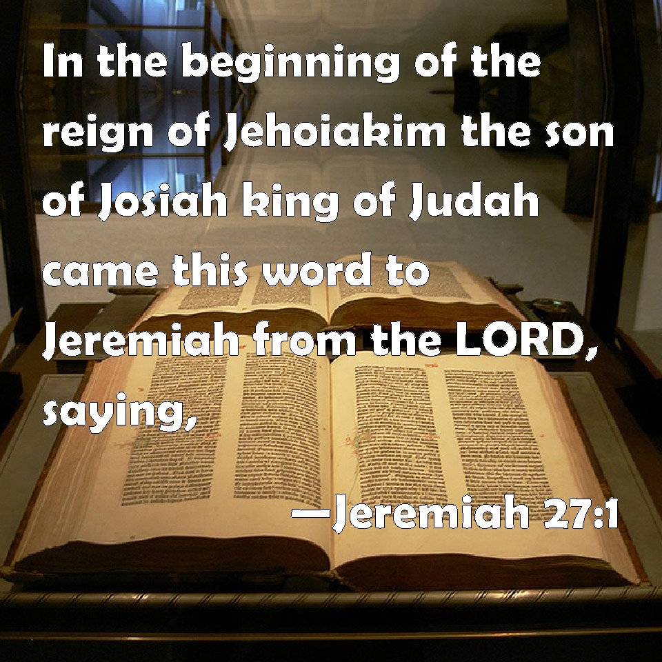 Choose a Background Jeremiah 27:1 In the beginning of the reign of Jehoiakim the son of Josiah king of Judah came this word to Jeremiah from the LORD, saying, KJV: In the beginning of the reign of Jehoiakim the son of Josiah king of Judah came this word unto Jeremiah from the LORD, saying, DRB: In the beginning of the reign of Joakim the son of Josias king of Juda, this word came to Jeremias from the Lord, saying: DBT: In the beginning of the reign of Jehoiakim the son of Josiah, the king of Judah, came this word to Jeremiah from Jehovah, saying, ERV: In the beginning of the reign of Jehoiakim the son of Josiah, king of Judah, came this word unto Jeremiah from the LORD, saying, WBT: In the beginning of the reign of Jehoiakim the son of Josiah king of Judah, came this word to Jeremiah from the LORD, saying, WEB: In the beginning of the reign of Jehoiakim the son of Josiah, king of Judah, came this word to Jeremiah from Yahweh, saying, YLT: In the beginning of the reign of Jehoiakim son of Josiah, king of Judah, hath this word been unto Jeremiah from Jehovah, saying,Links Jeremiah 27:1 NIV • Jeremiah 27:1 NLT • Jeremiah 27:1 ESV • Jeremiah 27:1 NASB • Jeremiah 27:1 KJV • Jeremiah 27:1 Interlinear • Jeremiah 27:1 Commentaries • Jeremiah 27:1 Parallel Texts • Jeremiah 27:1 Bible Apps • Jeremiah 27:1 Parallel • Bible Hub |
