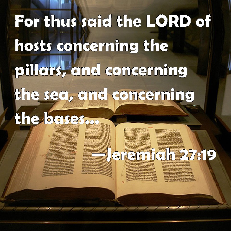 Choose a Background Jeremiah 27:19 For thus said the LORD of hosts concerning the pillars, and concerning the sea, and concerning the bases, and concerning the residue of the vessels that remain in this city. KJV: For thus saith the LORD of hosts concerning the pillars, and concerning the sea, and concerning the bases, and concerning the residue of the vessels that remain in this city, DRB: For thus saith the Lord of hosts d to the pillars, and to the sea, and to the bases, and to the rest of the vessels that remain in this city: DBT: For thus saith Jehovah of hosts concerning the pillars, and concerning the sea, and concerning the bases, and concerning the rest of the vessels that are left in this city, ERV: For thus saith the LORD of hosts concerning the pillars, and concerning the sea, and concerning the bases, and concerning the residue of the vessels, that are left in this city, WBT: For thus saith the LORD of hosts concerning the pillars, and concerning the sea, and concerning the bases, and concerning the residue of the vessels that remain in this city, WEB: For thus says Yahweh of Armies concerning the pillars, and concerning the sea, and concerning the bases, and concerning the residue of the vessels that are left in this city, YLT: For thus said Jehovah of Hosts concerning the pillars, and concerning the sea, and concerning the bases, and concerning the rest of the vessels that are left in this city,Links Jeremiah 27:19 NIV • Jeremiah 27:19 NLT • Jeremiah 27:19 ESV • Jeremiah 27:19 NASB • Jeremiah 27:19 KJV • Jeremiah 27:19 Interlinear • Jeremiah 27:19 Commentaries • Jeremiah 27:19 Parallel Texts • Jeremiah 27:19 Bible Apps • Jeremiah 27:19 Parallel • Bible Hub |