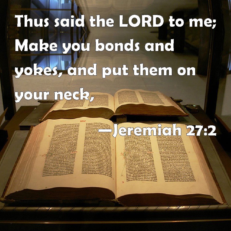 Choose a Background Jeremiah 27:2 Thus said the LORD to me; Make you bonds and yokes, and put them on your neck, KJV: Thus saith the LORD to me; Make thee bonds and yokes, and put them upon thy neck, DRB: Thus saith the Lord to me: Make thee bands, and chains: and thou shalt put them on thy neck. DBT: Thus hath Jehovah said unto me: Make thee bonds and yokes, and put them upon thy neck; ERV: Thus saith the LORD to me: Make thee bands and bars, and put them upon thy neck; WBT: Thus saith the LORD to me; Make for thee bonds and yokes, and put them upon thy neck, WEB: Thus says Yahweh to me: Make bonds and bars, and put them on your neck; YLT: 'Thus said Jehovah unto me, Make to thee bands and yokes,Links Jeremiah 27:2 NIV • Jeremiah 27:2 NLT • Jeremiah 27:2 ESV • Jeremiah 27:2 NASB • Jeremiah 27:2 KJV • Jeremiah 27:2 Interlinear • Jeremiah 27:2 Commentaries • Jeremiah 27:2 Parallel Texts • Jeremiah 27:2 Bible Apps • Jeremiah 27:2 Parallel • Bible Hub |