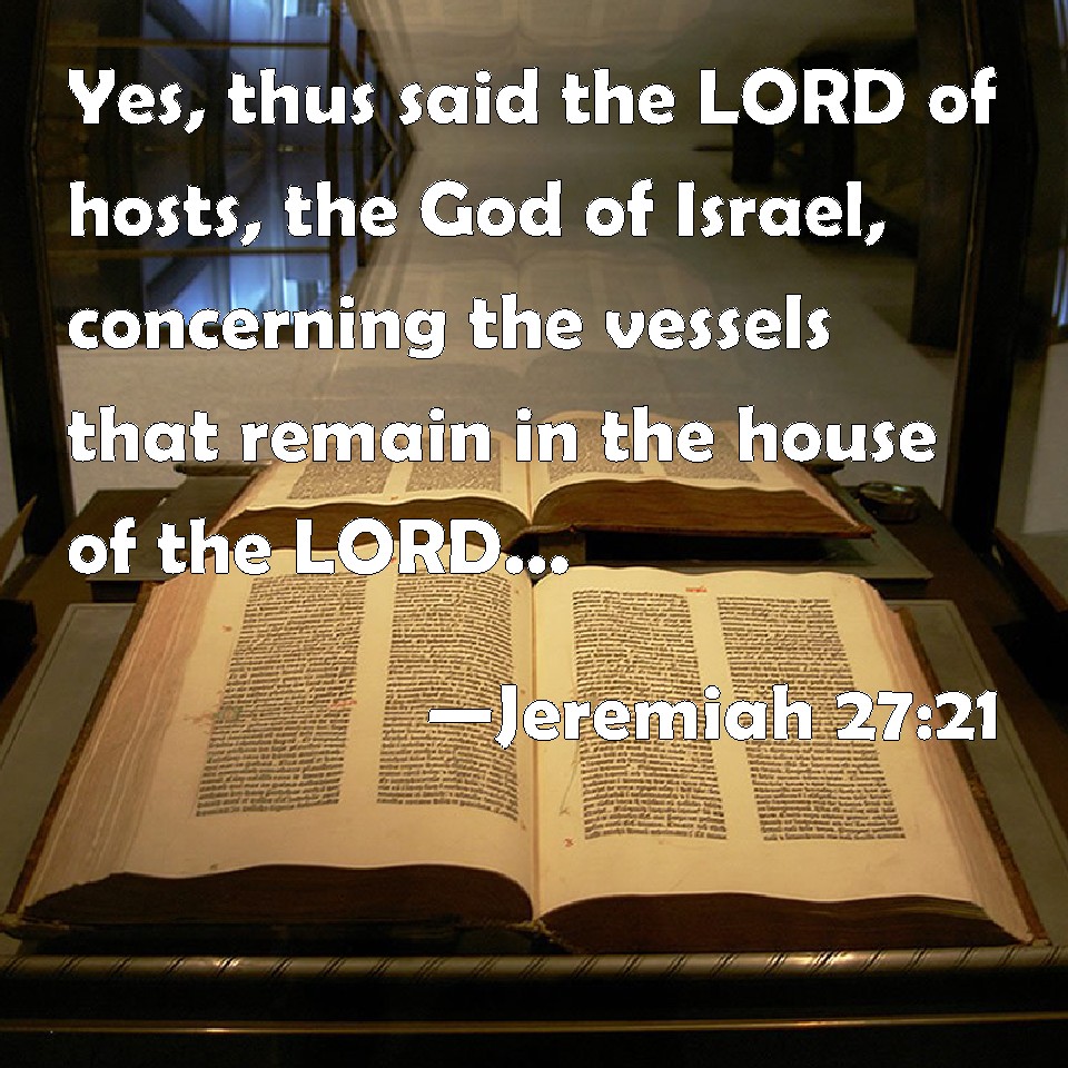 Choose a Background Jeremiah 27:21 Yes, thus said the LORD of hosts, the God of Israel, concerning the vessels that remain in the house of the LORD, and in the house of the king of Judah and of Jerusalem; KJV: Yea, thus saith the LORD of hosts, the God of Israel, concerning the vessels that remain in the house of the LORD, and in the house of the king of Judah and of Jerusalem; DRB: For thus saith the Lord of hosts the God of Israel, to the vessels that are left in the house of the Lord, and in the house of the king of Juda and Jerusalem: DBT: yea, thus saith Jehovah of hosts, the God of Israel, concerning the vessels that are left in the house of Jehovah, and in the house of the king of Judah, and in Jerusalem: ERV: yea, thus saith the LORD of hosts, the God of Israel, concerning the vessels that are left in the house of the LORD, and in the house of the king of Judah, and at Jerusalem: WBT: Yes, thus saith the LORD of hosts, the God of Israel, concerning the vessels that remain in the house of the LORD, and in the house of the king of Judah and of Jerusalem; WEB: yes, thus says Yahweh of Armies, the God of Israel, concerning the vessels that are left in the house of Yahweh, and in the house of the king of Judah, and at Jerusalem: YLT: Surely thus said Jehovah of Hosts, God of Israel, concerning the vessels that are left of the house of Jehovah, and of the house of the king of Judah, and in Jerusalem:Links Jeremiah 27:21 NIV • Jeremiah 27:21 NLT • Jeremiah 27:21 ESV • Jeremiah 27:21 NASB • Jeremiah 27:21 KJV • Jeremiah 27:21 Interlinear • Jeremiah 27:21 Commentaries • Jeremiah 27:21 Parallel Texts • Jeremiah 27:21 Bible Apps • Jeremiah 27:21 Parallel • Bible Hub |