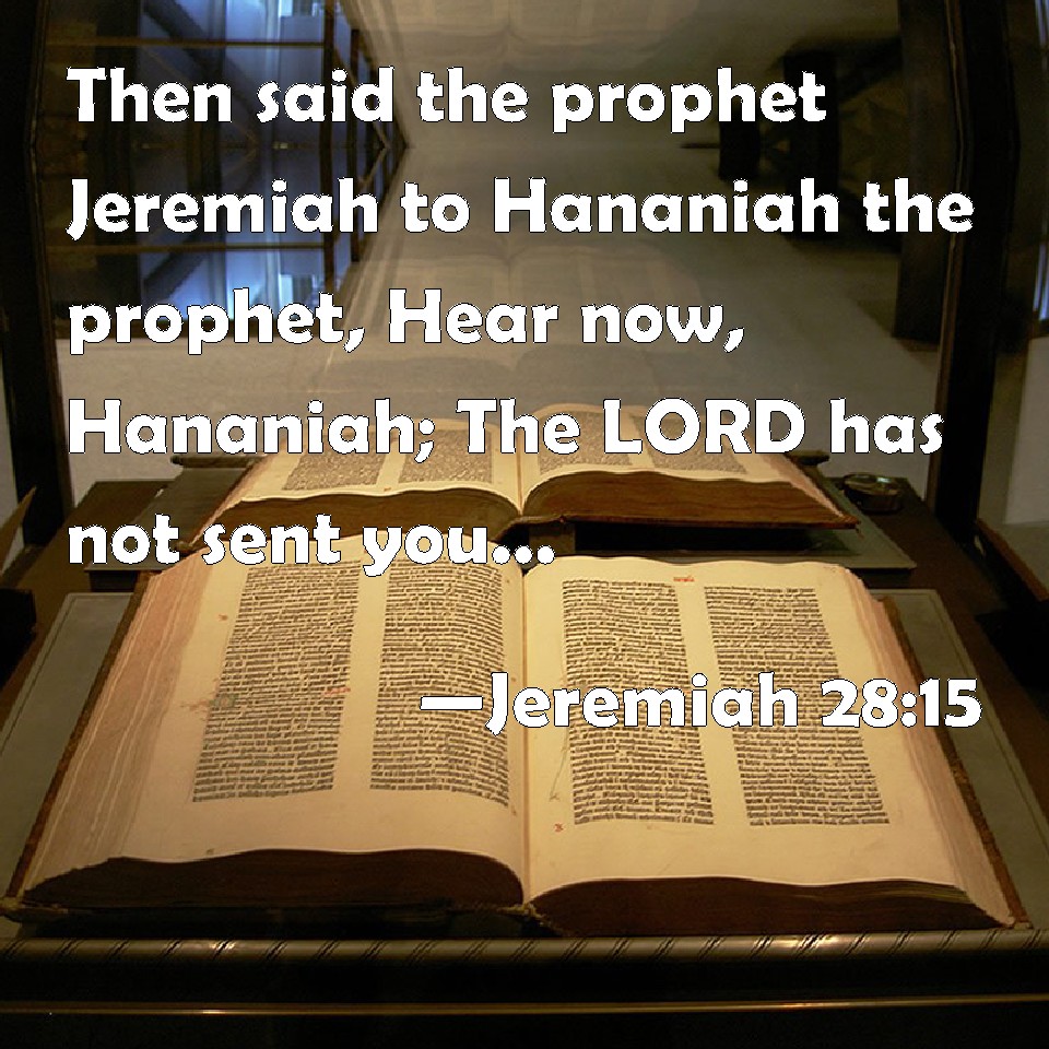 Choose a Background Jeremiah 28:15 Then said the prophet Jeremiah to Hananiah the prophet, Hear now, Hananiah; The LORD has not sent you; but you make this people to trust in a lie. KJV: Then said the prophet Jeremiah unto Hananiah the prophet, Hear now, Hananiah; The LORD hath not sent thee; but thou makest this people to trust in a lie. DRB: And Jeremias the prophet said to Hananias the prophet: Hear now, Hananias: the Lord hath not sent thee, and thou hast made this people to trust in a lie. DBT: And the prophet Jeremiah said unto the prophet Hananiah, Hear now, Hananiah: Jehovah hath not sent thee; and thou makest this people to trust in falsehood. ERV: Then said the prophet Jeremiah unto Hananiah the prophet, Hear now, Hananiah; the LORD hath not sent thee; but thou makest this people to trust in a lie. WBT: Then said the prophet Jeremiah to Hananiah the prophet, Hear now, Hananiah; The LORD hath not sent thee; but thou makest this people to trust in a lie. WEB: Then the prophet Jeremiah said to Hananiah the prophet, Hear now, Hananiah: Yahweh has not sent you; but you make this people to trust in a lie. YLT: And Jeremiah the prophet saith unto Hananiah the prophet, 'Hear, I pray thee, O Hananiah; Jehovah hath not sent thee, and thou hast caused this people to trust on falsehood.Links Jeremiah 28:15 NIV • Jeremiah 28:15 NLT • Jeremiah 28:15 ESV • Jeremiah 28:15 NASB • Jeremiah 28:15 KJV • Jeremiah 28:15 Interlinear • Jeremiah 28:15 Commentaries • Jeremiah 28:15 Parallel Texts • Jeremiah 28:15 Bible Apps • Jeremiah 28:15 Parallel • Bible Hub |