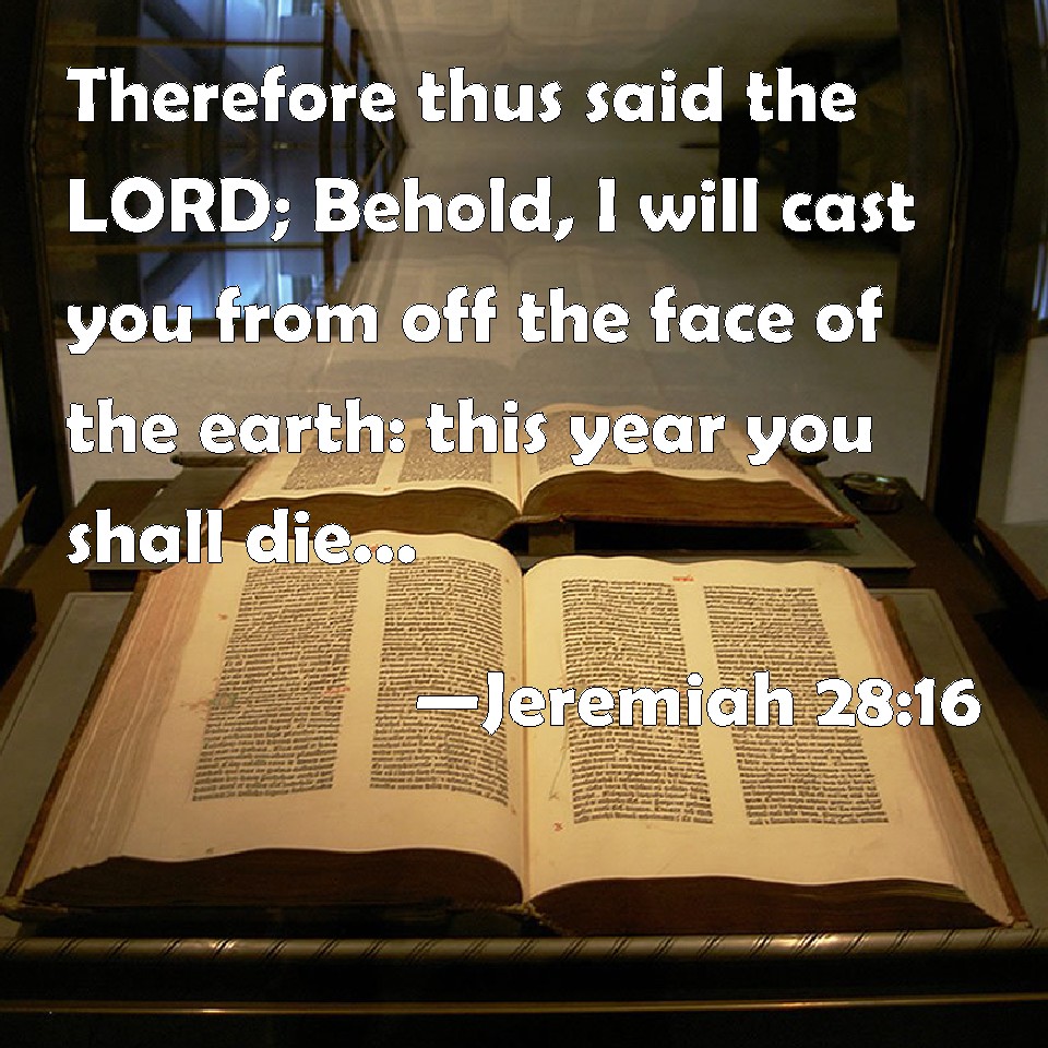 Choose a Background Jeremiah 28:16 Therefore thus said the LORD; Behold, I will cast you from off the face of the earth: this year you shall die, because you have taught rebellion against the LORD. KJV: Therefore thus saith the LORD; Behold, I will cast thee from off the face of the earth: this year thou shalt die, because thou hast taught rebellion against the LORD. DRB: Therefore thus saith the Lord: Behold I will send thee away from off the face of the earth: this year shalt thou die: for thou hast spoken against the Lord. DBT: Therefore thus saith Jehovah: Behold, I will cast thee from off the face of the earth: this year thou shalt die, for thou hast spoken revolt against Jehovah. ERV: Therefore thus saith the LORD, Behold, I will send thee away from off the face of the earth: this year thou shalt die, because thou hast spoken rebellion against the LORD. WBT: Therefore thus saith the LORD; Behold, I will cast thee from off the face of the earth: this year thou shalt die, because thou hast taught rebellion against the LORD. WEB: Therefore thus says Yahweh, Behold, I will send you away from off the surface of the earth: this year you shall die, because you have spoken rebellion against Yahweh. YLT: Therefore thus said Jehovah, Lo, I am casting thee from off the face of the ground; this year thou diest, for apostasy thou hast spoken concerning Jehovah.'Links Jeremiah 28:16 NIV • Jeremiah 28:16 NLT • Jeremiah 28:16 ESV • Jeremiah 28:16 NASB • Jeremiah 28:16 KJV • Jeremiah 28:16 Interlinear • Jeremiah 28:16 Commentaries • Jeremiah 28:16 Parallel Texts • Jeremiah 28:16 Bible Apps • Jeremiah 28:16 Parallel • Bible Hub |