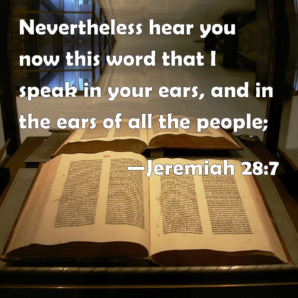 Choose a Background Jeremiah 28:7 Nevertheless hear you now this word that I speak in your ears, and in the ears of all the people; KJV: Nevertheless hear thou now this word that I speak in thine ears, and in the ears of all the people; DRB: Nevertheless hear this word that I speak in thy ears, and in the ears of all the people: DBT: Nevertheless, hear, I pray thee, this word which I speak in thine ears, and in the ears of all the people: ERV: Nevertheless hear thou now this word that I speak in thine ears, and in the ears of all the people: WBT: Nevertheless, now hear thou this word that I speak in thy ears, and in the ears of all the people: WEB: Nevertheless hear you now this word that I speak in your ears, and in the ears of all the people: YLT: 'Only, hear, I pray thee, this word that I am speaking in thine ears, and in the ears of all the people.Links Jeremiah 28:7 NIV • Jeremiah 28:7 NLT • Jeremiah 28:7 ESV • Jeremiah 28:7 NASB • Jeremiah 28:7 KJV • Jeremiah 28:7 Interlinear • Jeremiah 28:7 Commentaries • Jeremiah 28:7 Parallel Texts • Jeremiah 28:7 Bible Apps • Jeremiah 28:7 Parallel • Bible Hub |