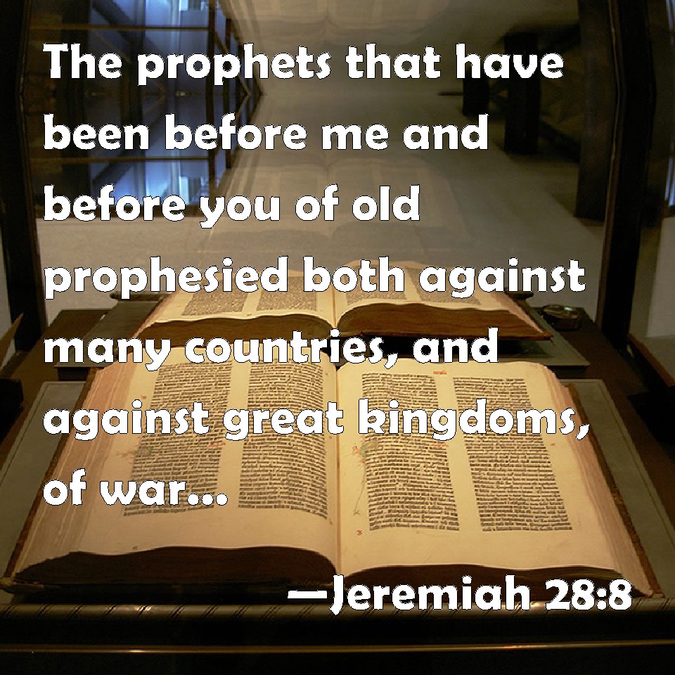 Choose a Background Jeremiah 28:8 The prophets that have been before me and before you of old prophesied both against many countries, and against great kingdoms, of war, and of evil, and of pestilence. KJV: The prophets that have been before me and before thee of old prophesied both against many countries, and against great kingdoms, of war, and of evil, and of pestilence. DRB: The prophets that have been before me, and before thee from the beginning, and have prophesied concerning many countries, and concerning great kingdoms, of war, and of affliction, and of famine. DBT: The prophets that have been before me and before thee of old, prophesied also concerning many countries and concerning great kingdoms, of war, and of evil, and of pestilence. ERV: The prophets that have been before me and before thee of old prophesied against many countries, and against great kingdoms, of war, and of evil, and of pestilence. WBT: The prophets that have been before me and before thee of old prophesied both against many countries, and against great kingdoms, of war, and of evil, and of pestilence. WEB: The prophets who have been before me and before you of old prophesied against many countries, and against great kingdoms, of war, and of evil, and of pestilence. YLT: The prophets who have been before me, and before thee, from of old, even they prophesy concerning many lands, and concerning great kingdoms, of battle, and of evil, and of pestilence.Links Jeremiah 28:8 NIV • Jeremiah 28:8 NLT • Jeremiah 28:8 ESV • Jeremiah 28:8 NASB • Jeremiah 28:8 KJV • Jeremiah 28:8 Interlinear • Jeremiah 28:8 Commentaries • Jeremiah 28:8 Parallel Texts • Jeremiah 28:8 Bible Apps • Jeremiah 28:8 Parallel • Bible Hub |