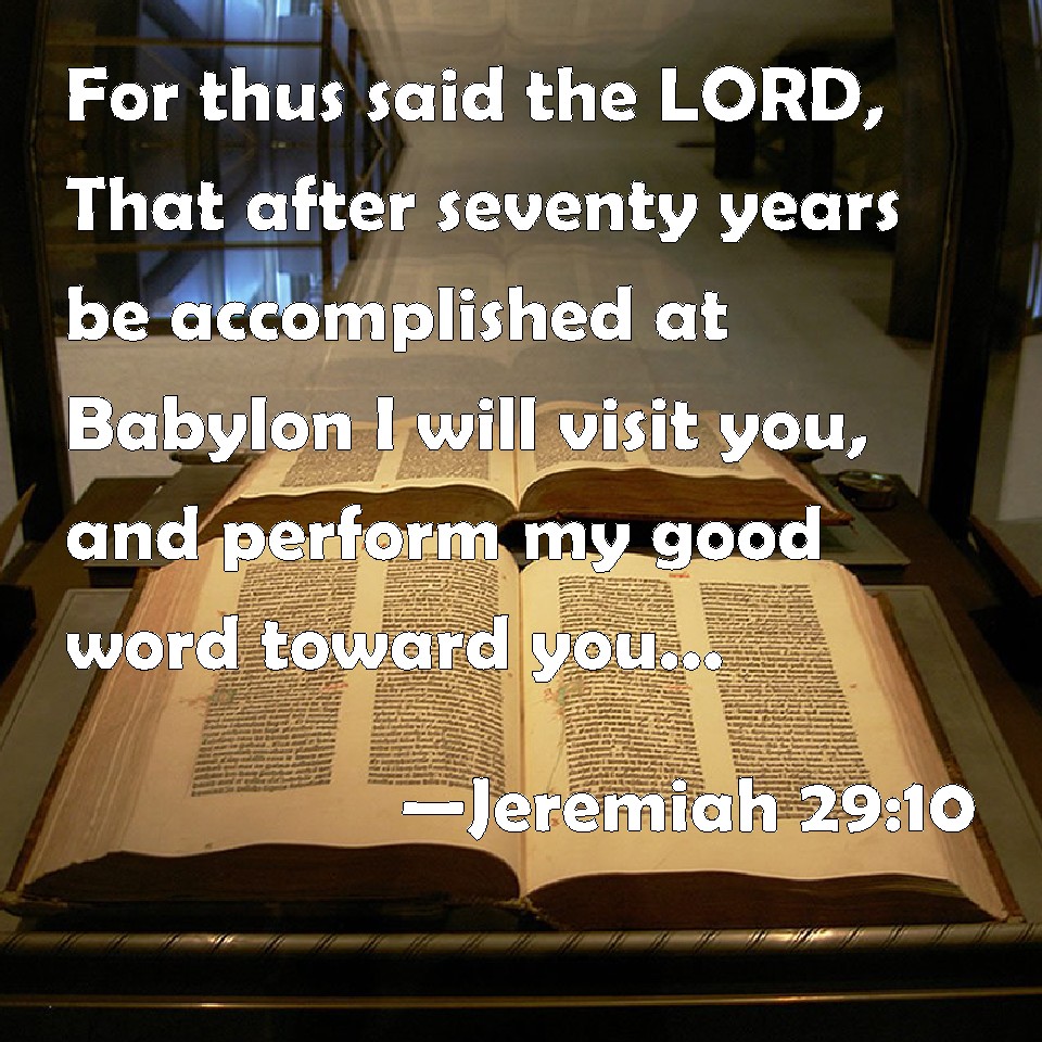 Choose a Background Jeremiah 29:10 For thus said the LORD, That after seventy years be accomplished at Babylon I will visit you, and perform my good word toward you, in causing you to return to this place. KJV: For thus saith the LORD, That after seventy years be accomplished at Babylon I will visit you, and perform my good word toward you, in causing you to return to this place. DRB: For thus saith the Lord: When the seventy years shall begin to be accomplished in Babylon, I will visit you: and I will perform my good word in your favour, to bring you again to this place. DBT: For thus saith Jehovah: When seventy years shall be accomplished for Babylon I will visit you, and perform my good word toward you, in bringing you back to this place. ERV: For thus saith the LORD, After seventy years be accomplished for Babylon, I will visit you, and perform my good word toward you, in causing you to return to this place. WBT: For thus saith the LORD, That after seventy years shall be accomplished at Babylon I will visit you, and perform my good word towards you, in causing you to return to this place. WEB: For thus says Yahweh, After seventy years are accomplished for Babylon, I will visit you, and perform my good word toward you, in causing you to return to this place. YLT: For thus said Jehovah, Surely at the fulness of Babylon — seventy years — I inspect you, and have established towards you My good word, to bring you back unto this place.Links Jeremiah 29:10 NIV • Jeremiah 29:10 NLT • Jeremiah 29:10 ESV • Jeremiah 29:10 NASB • Jeremiah 29:10 KJV • Jeremiah 29:10 Interlinear • Jeremiah 29:10 Commentaries • Jeremiah 29:10 Parallel Texts • Jeremiah 29:10 Bible Apps • Jeremiah 29:10 Parallel • Bible Hub |