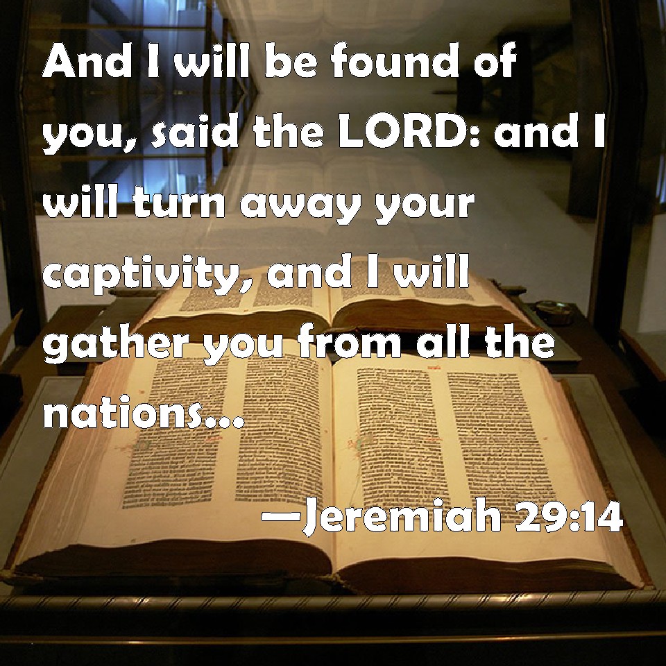 Choose a Background Jeremiah 29:14 And I will be found of you, said the LORD: and I will turn away your captivity, and I will gather you from all the nations, and from all the places where I have driven you, said the LORD; and I will bring you again into the place from where I caused you to be carried away captive. KJV: And I will be found of you, saith the LORD: and I will turn away your captivity, and I will gather you from all the nations, and from all the places whither I have driven you, saith the LORD; and I will bring you again into the place whence I caused you to be carried away captive. DRB: And I will be found by you, saith the Lord: and I will bring back your captivity, and I will gather you out of all nations, and from all the places to which I have driven you out, saith the Lord: and I will bring you back from the place to which I caused you to be carried away captive. DBT: and I will be found of you, saith Jehovah. And I will turn your captivity, and I will gather you from all the nations, and from all the places whither I have driven you, saith Jehovah; and I will bring you again into the place whence I have caused you to be carried away captive. ERV: And I will be found of you, saith the LORD, and I will turn again your captivity, and I will gather you from all the nations, and from all the places whither I have driven you, saith the LORD; and I will bring you again unto the place whence I caused you to be carried away captive. WBT: And I will be found by you, saith the LORD: and I will turn away your captivity, and I will gather you from all the nations, and from all the places whither I have driven you, saith the LORD: and I will bring you again into the place whence I caused you to be carried away captive. WEB: I will be found by you, says Yahweh, and I will turn again your captivity, and I will gather you from all the nations, and from all the places where I have driven you, says Yahweh; and I will bring you again to the place from where I caused you to be carried away captive. YLT: And I have been found of you — an affirmation of Jehovah; and I have turned back to your captivity, and have gathered you out of all the nations, and out of all the places whither I have driven you — an affirmation of Jehovah — and I have brought you back unto the place whence I removed you.Links Jeremiah 29:14 NIV • Jeremiah 29:14 NLT • Jeremiah 29:14 ESV • Jeremiah 29:14 NASB • Jeremiah 29:14 KJV • Jeremiah 29:14 Interlinear • Jeremiah 29:14 Commentaries • Jeremiah 29:14 Parallel Texts • Jeremiah 29:14 Bible Apps • Jeremiah 29:14 Parallel • Bible Hub |