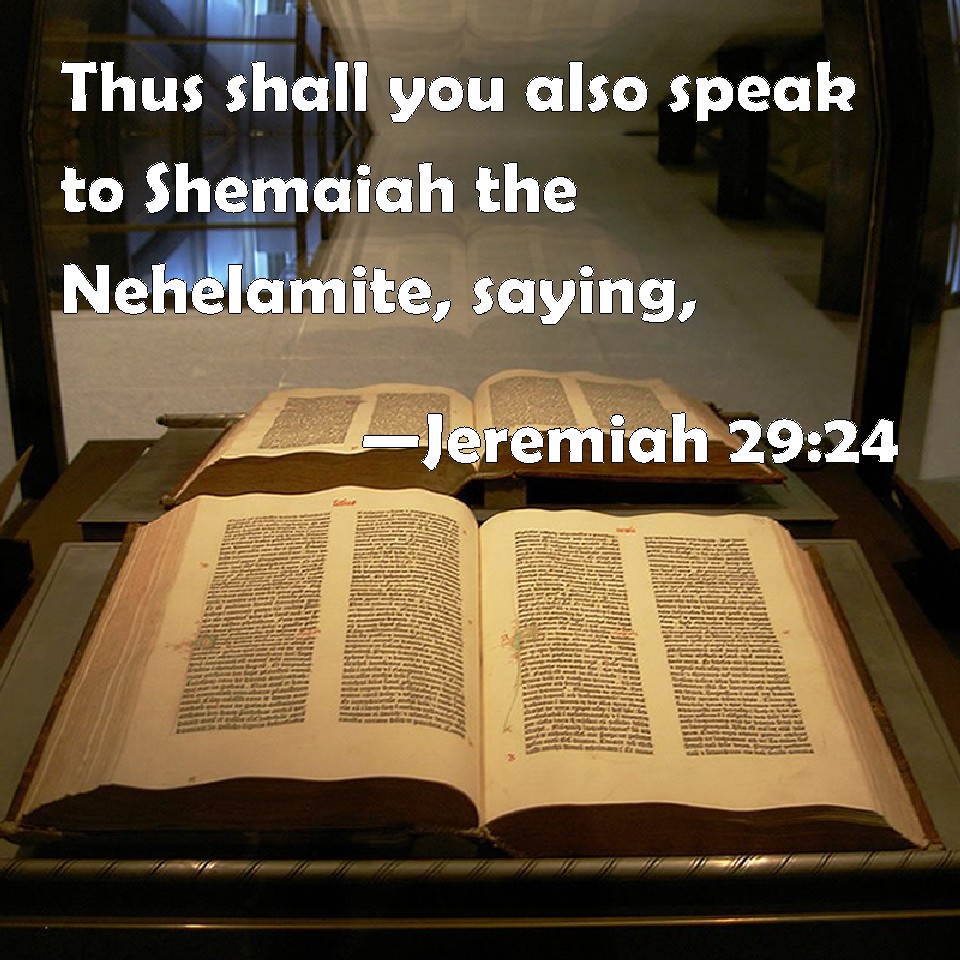 Choose a Background Jeremiah 29:24 Thus shall you also speak to Shemaiah the Nehelamite, saying, KJV: Thus shalt thou also speak to Shemaiah the Nehelamite, saying, DRB: And to Semeias the Nehelamite thou shalt say: DBT: And thou shalt speak to Shemaiah the Nehelamite, saying, ERV: And concerning Shemaiah the Nehelamite thou shalt speak, saying, WBT: Thus shalt thou also speak to Shemaiah the Nehelamite, saying, WEB: Concerning Shemaiah the Nehelamite you shall speak, saying, YLT: 'And unto Shemaiah the Nehelamite thou dost speak, saying,Links Jeremiah 29:24 NIV • Jeremiah 29:24 NLT • Jeremiah 29:24 ESV • Jeremiah 29:24 NASB • Jeremiah 29:24 KJV • Jeremiah 29:24 Interlinear • Jeremiah 29:24 Commentaries • Jeremiah 29:24 Parallel Texts • Jeremiah 29:24 Bible Apps • Jeremiah 29:24 Parallel • Bible Hub |