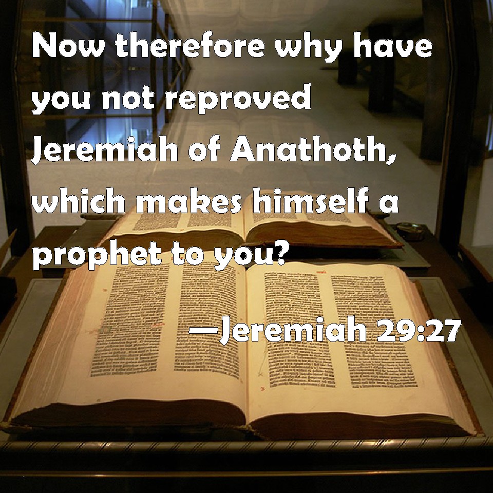 Choose a Background Jeremiah 29:27 Now therefore why have you not reproved Jeremiah of Anathoth, which makes himself a prophet to you? KJV: Now therefore why hast thou not reproved Jeremiah of Anathoth, which maketh himself a prophet to you? DRB: And now why hast thou not rebuked Jeremias the Anathothite, who prophesieth to you? DBT: And now, why hast thou not reproved Jeremiah of Anathoth, who maketh himself a prophet to you? ERV: Now therefore, why hast thou not rebuked Jeremiah of Anathoth, which maketh himself a prophet to you, WBT: Now therefore why hast thou not reproved Jeremiah of Anathoth, who maketh himself a prophet to you? WEB: Now therefore, why have you not rebuked Jeremiah of Anathoth, who makes himself a prophet to you, YLT: And now, why hast thou not pushed against Jeremiah of Anathoth, who is making himself a prophet to you?Links Jeremiah 29:27 NIV • Jeremiah 29:27 NLT • Jeremiah 29:27 ESV • Jeremiah 29:27 NASB • Jeremiah 29:27 KJV • Jeremiah 29:27 Interlinear • Jeremiah 29:27 Commentaries • Jeremiah 29:27 Parallel Texts • Jeremiah 29:27 Bible Apps • Jeremiah 29:27 Parallel • Bible Hub |