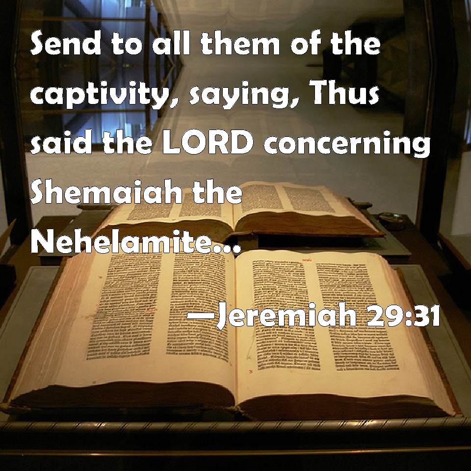 Choose a Background Jeremiah 29:31 Send to all them of the captivity, saying, Thus said the LORD concerning Shemaiah the Nehelamite; Because that Shemaiah has prophesied to you, and I sent him not, and he caused you to trust in a lie: KJV: Send to all them of the captivity, saying, Thus saith the LORD concerning Shemaiah the Nehelamite; Because that Shemaiah hath prophesied unto you, and I sent him not, and he caused you to trust in a lie: DRB: Send to all them of the captivity, saying: Thus saith the Lord to Semeias the Nehelamite: Because Semeias hath prophesied to you, and I sent him not: and hath caused you to trust in a lie : DBT: Send to all them of the captivity, saying, Thus saith Jehovah concerning Shemaiah the Nehelamite: Because that Shemaiah hath prophesied unto you, and I sent him not, and he hath caused you to trust in falsehood; ERV: Send to all them of the captivity, saying, Thus saith the LORD concerning Shemaiah the Nehelamite: Because that Shemaiah hath prophesied unto you, and I sent him not, and he hath caused you to trust in a lie; WBT: Send to all them of the captivity, saying, Thus saith the LORD concerning Shemaiah the Nehelamite; Because Shemaiah hath prophesied to you, and I sent him not, and he caused you to trust in a lie: WEB: Send to all them of the captivity, saying, Thus says Yahweh concerning Shemaiah the Nehelamite: Because Shemaiah has prophesied to you, and I didn't send him, and he has caused you to trust in a lie; YLT: Send unto all the removal, saying, Thus said Jehovah concerning Shemaiah the Nehelamite, Because that Shemaiah prophesied to you, and I — I have not sent him, and he doth cause you to trust on falsehood,Links Jeremiah 29:31 NIV • Jeremiah 29:31 NLT • Jeremiah 29:31 ESV • Jeremiah 29:31 NASB • Jeremiah 29:31 KJV • Jeremiah 29:31 Interlinear • Jeremiah 29:31 Commentaries • Jeremiah 29:31 Parallel Texts • Jeremiah 29:31 Bible Apps • Jeremiah 29:31 Parallel • Bible Hub |