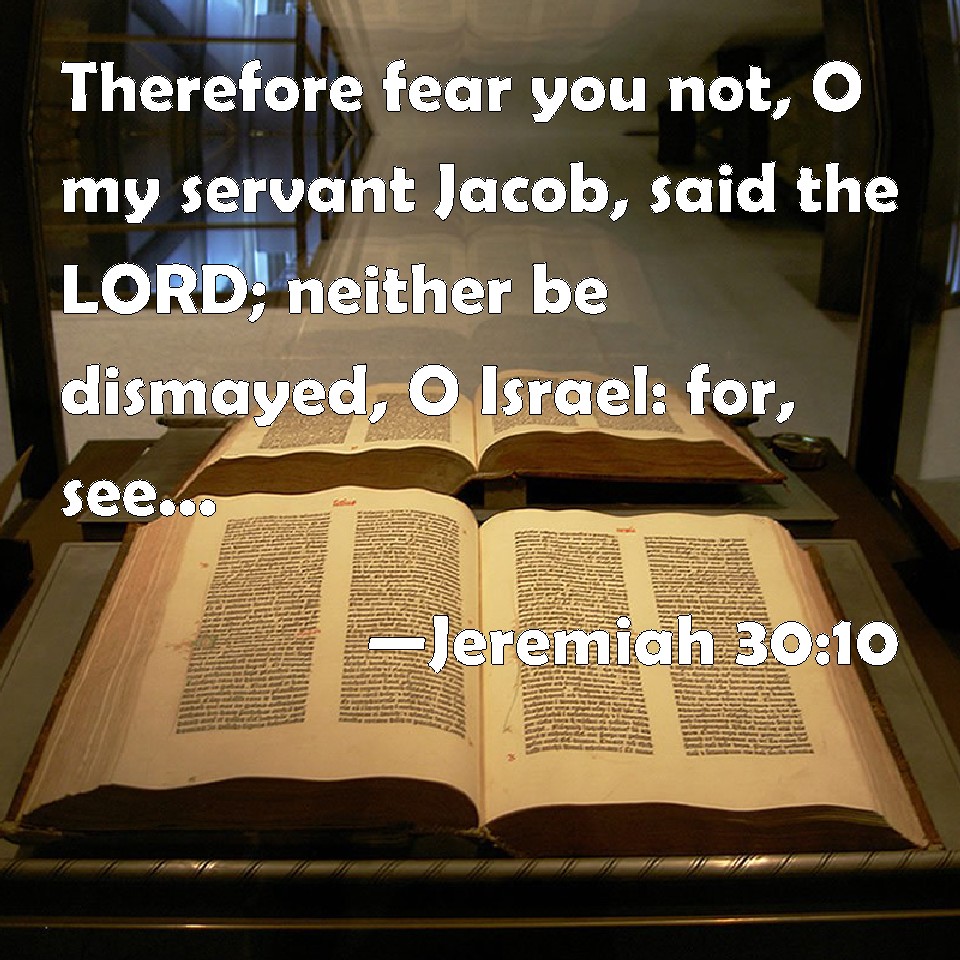 Choose a Background Jeremiah 30:10 Therefore fear you not, O my servant Jacob, said the LORD; neither be dismayed, O Israel: for, see, I will save you from afar, and your seed from the land of their captivity; and Jacob shall return, and shall be in rest, and be quiet, and none shall make him afraid. KJV: Therefore fear thou not, O my servant Jacob, saith the LORD; neither be dismayed, O Israel: for, lo, I will save thee from afar, and thy seed from the land of their captivity; and Jacob shall return, and shall be in rest, and be quiet, and none shall make him afraid. DRB: Therefore fear thou not, my servant Jacob, saith the Lord, neither be dismayed, O Israel: for behold, I will save thee from a country afar off, and thy seed from the land of their captivity: and Jacob shall return, and be at rest, and abound with all good things, and there shall be none whom he may fear: DBT: And thou, my servant Jacob, fear not, saith Jehovah; neither be dismayed, O Israel: for behold, I will save thee from afar, and thy seed from the land of their captivity; and Jacob shall return, and shall be in rest, and at ease, and none shall make him afraid. ERV: Therefore fear thou not, O Jacob my servant, saith the LORD; neither be dismayed, O Israel: for, lo, I will save thee from afar, and thy seed from the land of their captivity; and Jacob shall return, and shall be quiet and at ease, and none shall make him afraid. WBT: Therefore fear thou not, O my servant Jacob, saith the LORD; neither be dismayed, O Israel: for lo, I will save thee from afar, and thy seed from the land of their captivity; and Jacob shall return, and shall be in rest, and quiet, and none shall make him afraid. WEB: Therefore don't you be afraid, O Jacob my servant, says Yahweh; neither be dismayed, Israel: for, behold, I will save you from afar, and your seed from the land of their captivity; and Jacob shall return, and shall be quiet and at ease, and none shall make him afraid. YLT: And thou, be not afraid, My servant Jacob, An affirmation of Jehovah, Nor be affrighted, O Israel, For, lo, I am saving thee from afar, And thy seed from the land of their captivity, And Jacob hath turned back and rested, And is quiet, and there is none troubling.Links Jeremiah 30:10 NIV • Jeremiah 30:10 NLT • Jeremiah 30:10 ESV • Jeremiah 30:10 NASB • Jeremiah 30:10 KJV • Jeremiah 30:10 Interlinear • Jeremiah 30:10 Commentaries • Jeremiah 30:10 Parallel Texts • Jeremiah 30:10 Bible Apps • Jeremiah 30:10 Parallel • Bible Hub |