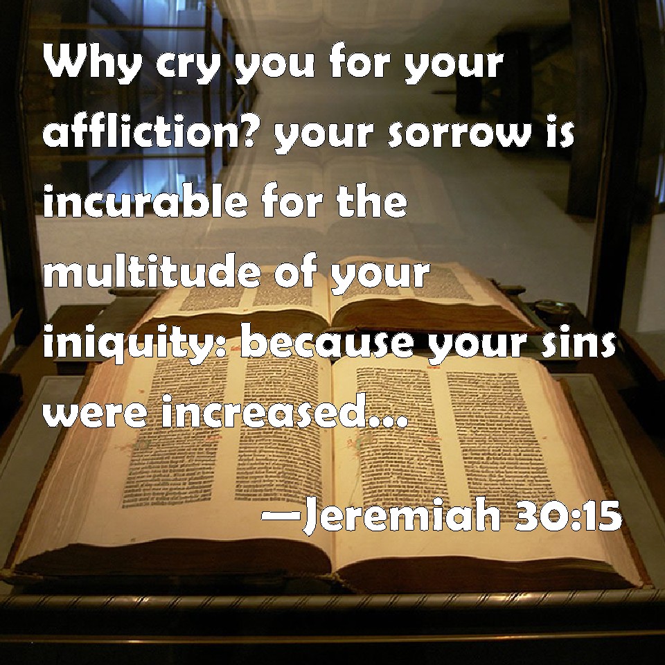 Choose a Background Jeremiah 30:15 Why cry you for your affliction? your sorrow is incurable for the multitude of your iniquity: because your sins were increased, I have done these things to you. KJV: Why criest thou for thine affliction? thy sorrow is incurable for the multitude of thine iniquity: because thy sins were increased, I have done these things unto thee. DRB: Why criest thou for thy affliction? thy sorrow is incurable: for the multitude of thy iniquity, and for thy hardened sins I have done these things to thee. DBT: Why criest thou because of thy bruise? thy sorrow is incurable; for the greatness of thine iniquity, because thy sins are manifold, I have done these things unto thee. ERV: Why criest thou for thy hurt? thy pain is incurable: for the greatness of thine iniquity, because thy sins were increased, I have done these things unto thee. WBT: Why criest thou for thy affliction? thy sorrow is incurable for the multitude of thy iniquity: because thy sins were increased, I have done these things to thee. WEB: Why do you cry for your hurt? Your pain is incurable: for the greatness of your iniquity, because your sins were increased, I have done these things to you. YLT: What! — thou criest concerning thy breach! Incurable is thy pain, Because of the abundance of thy iniquity, Mighty have been thy sins! I have done these to thee.Links Jeremiah 30:15 NIV • Jeremiah 30:15 NLT • Jeremiah 30:15 ESV • Jeremiah 30:15 NASB • Jeremiah 30:15 KJV • Jeremiah 30:15 Interlinear • Jeremiah 30:15 Commentaries • Jeremiah 30:15 Parallel Texts • Jeremiah 30:15 Bible Apps • Jeremiah 30:15 Parallel • Bible Hub |