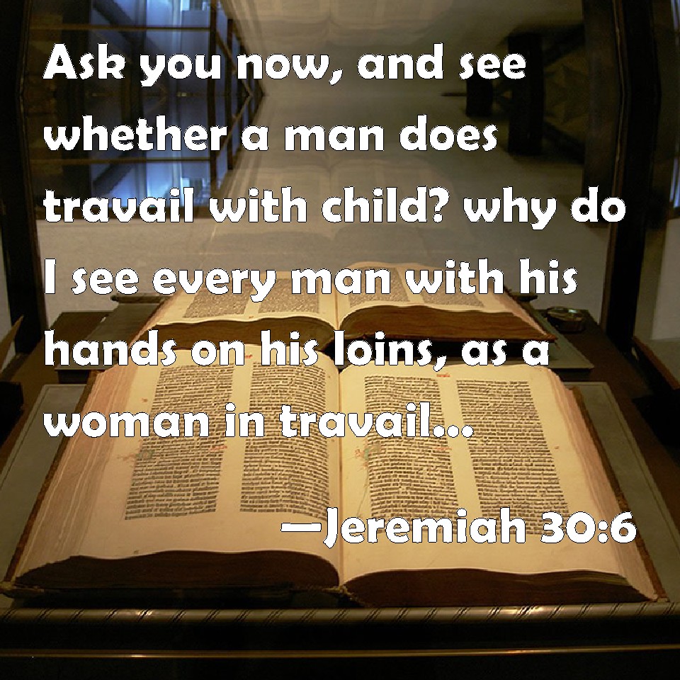 Choose a Background Jeremiah 30:6 Ask you now, and see whether a man does travail with child? why do I see every man with his hands on his loins, as a woman in travail, and all faces are turned into paleness? KJV: Ask ye now, and see whether a man doth travail with child? wherefore do I see every man with his hands on his loins, as a woman in travail, and all faces are turned into paleness? DRB: Ask ye, and see if a man bear children ? why then have I seen every man with his hands on his loins, like a woman in labour, and all faces are turned yellow? DBT: Ask ye now, and see, whether a male doth travail with child? Wherefore do I see every man with his hands on his loins, as a woman in travail; and all faces are turned into paleness? ERV: Ask ye now, and see whether a man doth travail with child: wherefore do I see every man with his hands on his loins, as a woman in travail, and all faces are turned into paleness? WBT: Ask ye now, and see whether a man doth travail with child? Why do I see every man with his hands on his loins, as a woman in travail, and all faces are turned into paleness? WEB: Ask now, and see whether a man does travail with child: why do I see every man with his hands on his waist, as a woman in travail, and all faces are turned into paleness? YLT: Ask, I pray you, and see, is a male bringing forth? Wherefore have I seen every man, His hands on his loins, as a travailing woman, And all faces have been turned to paleness?Links Jeremiah 30:6 NIV • Jeremiah 30:6 NLT • Jeremiah 30:6 ESV • Jeremiah 30:6 NASB • Jeremiah 30:6 KJV • Jeremiah 30:6 Interlinear • Jeremiah 30:6 Commentaries • Jeremiah 30:6 Parallel Texts • Jeremiah 30:6 Bible Apps • Jeremiah 30:6 Parallel • Bible Hub |
