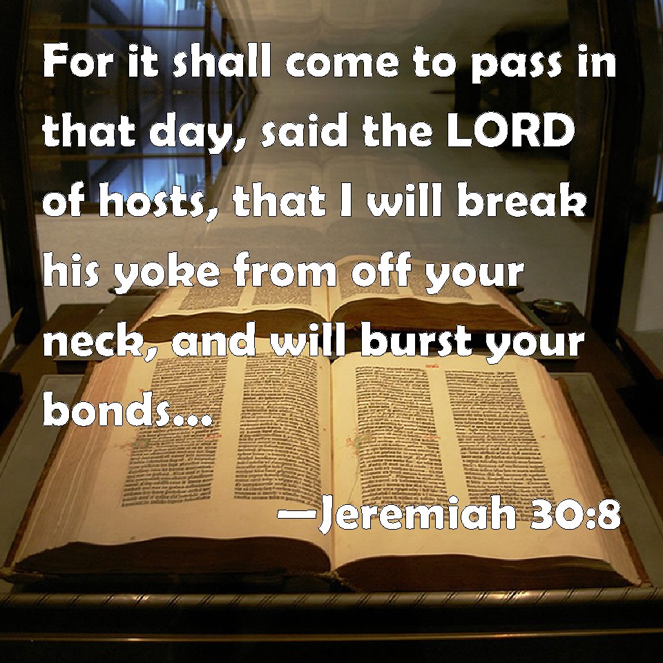 Choose a Background Jeremiah 30:8 For it shall come to pass in that day, said the LORD of hosts, that I will break his yoke from off your neck, and will burst your bonds, and strangers shall no more serve themselves of him: KJV: For it shall come to pass in that day, saith the LORD of hosts, that I will break his yoke from off thy neck, and will burst thy bonds, and strangers shall no more serve themselves of him: DRB: And it shall come to pass in that day, saith the Lord of hosts, that I will break his yoke from off thy neck, and will burst his bands: and strangers shall no more rule over him: DBT: And it shall come to pass in that day, saith Jehovah of hosts, I will break his yoke from off thy neck, and will burst thy bonds, and strangers shall no more reduce him to servitude. ERV: And it shall come to pass in that day, saith the LORD of hosts, that I will break his yoke from off thy neck, and will burst thy bands; and strangers shall no more serve themselves of him: WBT: For it shall come to pass in that day, saith the LORD of hosts, that I will break his yoke from off thy neck, and will burst thy bonds, and strangers shall no more bring him into subjection: WEB: It shall come to pass in that day, says Yahweh of Armies, that I will break his yoke from off your neck, and will burst your bonds; and strangers shall no more make him their bondservant; YLT: And it hath come to pass, in that day, An affirmation of Jehovah of Hosts, I break his yoke from off thy neck, And thy bands I draw away, And lay no more service on him do strangers.Links Jeremiah 30:8 NIV • Jeremiah 30:8 NLT • Jeremiah 30:8 ESV • Jeremiah 30:8 NASB • Jeremiah 30:8 KJV • Jeremiah 30:8 Interlinear • Jeremiah 30:8 Commentaries • Jeremiah 30:8 Parallel Texts • Jeremiah 30:8 Bible Apps • Jeremiah 30:8 Parallel • Bible Hub |