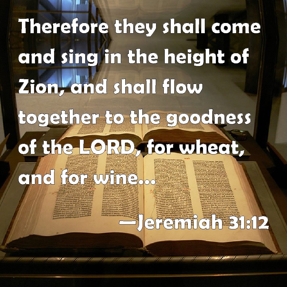 Choose a Background Jeremiah 31:12 Therefore they shall come and sing in the height of Zion, and shall flow together to the goodness of the LORD, for wheat, and for wine, and for oil, and for the young of the flock and of the herd: and their soul shall be as a watered garden; and they shall not sorrow any more at all. KJV: Therefore they shall come and sing in the height of Zion, and shall flow together to the goodness of the LORD, for wheat, and for wine, and for oil, and for the young of the flock and of the herd: and their soul shall be as a watered garden; and they shall not sorrow any more at all. DRB: And they shall come, and shall give praise in mount Sion: and they shall flow together to the good things of the Lord, for the corn, and wine, and oil, and the increase of cattle and herds, and their soul shall be as a watered garden, and they shall be hungry no more. DBT: And they shall come and sing aloud upon the height of Zion, and shall flow together to the goodness of Jehovah, for corn, and for new wine, and for oil, and for the young of the flock and of the herd; and their soul shall be as a watered garden, and they shall not languish any more at all. ERV: And they shall come and sing in the height of Zion, and shall flow together unto the goodness of the LORD, to the corn, and to the wine, and to the oil, and to the young of the flock and of the herd: and their soul shall be as a watered garden; and they shall not sorrow any more at all. WBT: Therefore they shall come and sing in the hight of Zion, and shall flow together to the goodness of the LORD, for wheat, and for wine, and for oil, and for the young of the flock and of the herd: and their soul shall be as a watered garden; and they shall not sorrow any more at all. WEB: They shall come and sing in the height of Zion, and shall flow to the goodness of Yahweh, to the grain, and to the new wine, and to the oil, and to the young of the flock and of the herd: and their soul shall be as a watered garden; and they shall not sorrow any more at all. YLT: And they have come in, And have sung in the high place of Zion, And flowed unto the goodness of Jehovah, For wheat, and for new wine, and for oil, And for the young of the flock and herd, And their soul hath been as a watered garden, And they add not to grieve any more.Links Jeremiah 31:12 NIV • Jeremiah 31:12 NLT • Jeremiah 31:12 ESV • Jeremiah 31:12 NASB • Jeremiah 31:12 KJV • Jeremiah 31:12 Interlinear • Jeremiah 31:12 Commentaries • Jeremiah 31:12 Parallel Texts • Jeremiah 31:12 Bible Apps • Jeremiah 31:12 Parallel • Bible Hub |