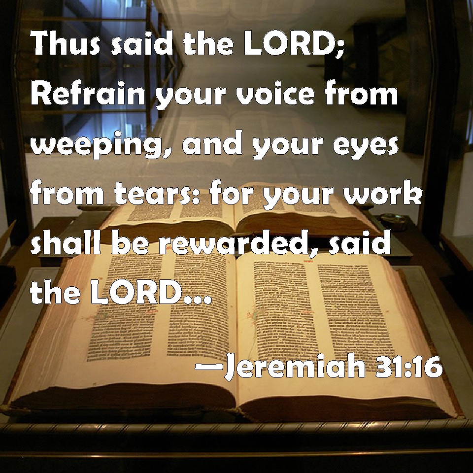 Choose a Background Jeremiah 31:16 Thus said the LORD; Refrain your voice from weeping, and your eyes from tears: for your work shall be rewarded, said the LORD; and they shall come again from the land of the enemy. KJV: Thus saith the LORD; Refrain thy voice from weeping, and thine eyes from tears: for thy work shall be rewarded, saith the LORD; and they shall come again from the land of the enemy. DRB: Thus saith the Lord: Let thy voice cease from weeping, and thy eyes from tears: for there is a reward for thy work, saith the Lord: and they shall return out of the land of the enemy. DBT: Thus saith Jehovah: Refrain thy voice from weeping, and thine eyes from tears; for there is a reward for thy work, saith Jehovah; and they shall come again from the land of the enemy. ERV: Thus saith the LORD: Refrain thy voice from weeping, and thine eyes from tears: for thy work shall be rewarded, saith the LORD; and they shall come again from the land of the enemy. WBT: Thus saith the LORD; Refrain thy voice from weeping, and thy eyes from tears: for thy work shall be rewarded, saith the LORD; and they shall come again from the land of the enemy. WEB: Thus says Yahweh: Refrain your voice from weeping, and your eyes from tears; for your work shall be rewarded, says Yahweh; and they shall come again from the land of the enemy. YLT: Thus said Jehovah: Withhold thy voice from weeping, and thine eyes from tears, For there is a reward for thy work, An affirmation of Jehovah, And they have turned back from the land of the enemy.Links Jeremiah 31:16 NIV • Jeremiah 31:16 NLT • Jeremiah 31:16 ESV • Jeremiah 31:16 NASB • Jeremiah 31:16 KJV • Jeremiah 31:16 Interlinear • Jeremiah 31:16 Commentaries • Jeremiah 31:16 Parallel Texts • Jeremiah 31:16 Bible Apps • Jeremiah 31:16 Parallel • Bible Hub |