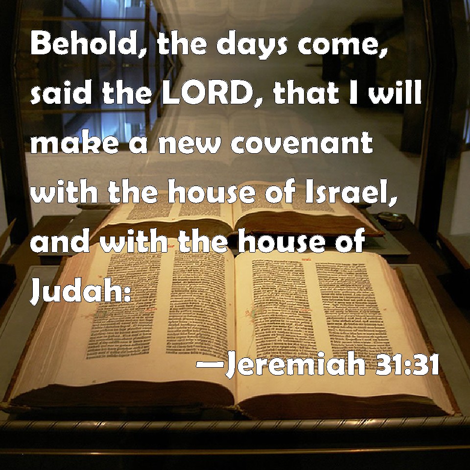 Choose a Background Jeremiah 31:31 Behold, the days come, said the LORD, that I will make a new covenant with the house of Israel, and with the house of Judah: KJV: Behold, the days come, saith the LORD, that I will make a new covenant with the house of Israel, and with the house of Judah: DRB: Behold the days shall come, saith the Lord, and I will make a new covenant with the house of Israel, and with the house of Juda: DBT: Behold, days come, saith Jehovah, that I will make a new covenant with the house of Israel and with the house of Judah: ERV: Behold, the days come, saith the LORD, that I will make a new covenant with the house of Israel, and with the house of Judah: WBT: Behold, the days come, saith the LORD, that I will make a new covenant with the house of Israel, and with the house of Judah: WEB: Behold, the days come, says Yahweh, that I will make a new covenant with the house of Israel, and with the house of Judah: YLT: Lo, days are coming, an affirmation of Jehovah, And I have made with the house of Israel And with the house of Judah a new covenant,Links Jeremiah 31:31 NIV • Jeremiah 31:31 NLT • Jeremiah 31:31 ESV • Jeremiah 31:31 NASB • Jeremiah 31:31 KJV • Jeremiah 31:31 Interlinear • Jeremiah 31:31 Commentaries • Jeremiah 31:31 Parallel Texts • Jeremiah 31:31 Bible Apps • Jeremiah 31:31 Parallel • Bible Hub |