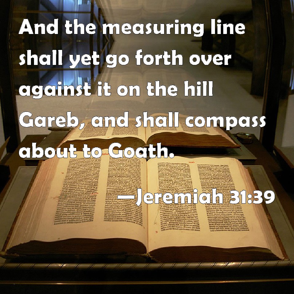 Jeremiah 31:39 And the measuring line shall yet go forth over against it on the hill Gareb, and shall compass about to Goath.