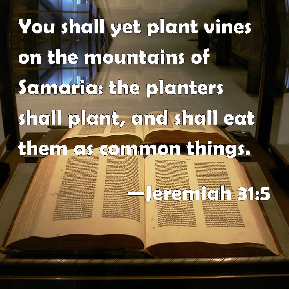 Jeremiah 31:5 You shall yet plant vines on the mountains of Samaria: the planters shall plant, and shall eat them as common things.