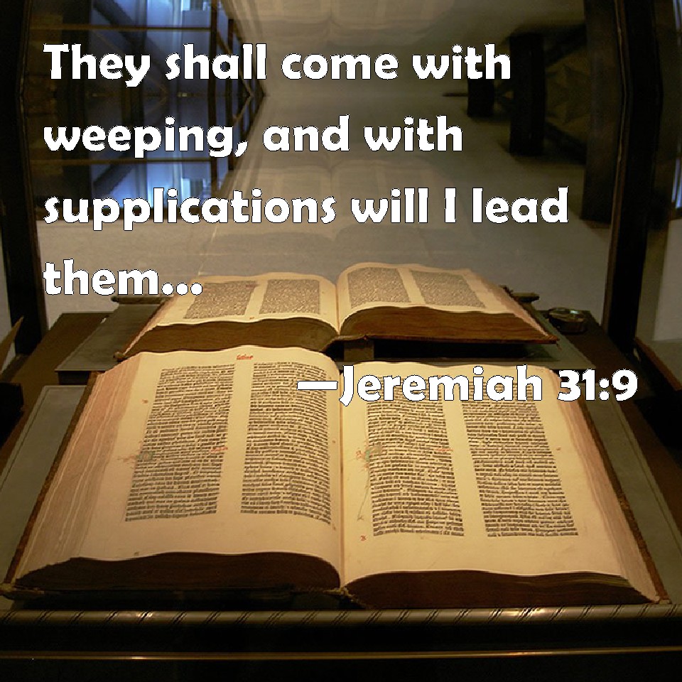 Choose a Background Jeremiah 31:9 They shall come with weeping, and with supplications will I lead them: I will cause them to walk by the rivers of waters in a straight way, wherein they shall not stumble: for I am a father to Israel, and Ephraim is my firstborn. KJV: They shall come with weeping, and with supplications will I lead them: I will cause them to walk by the rivers of waters in a straight way, wherein they shall not stumble: for I am a father to Israel, and Ephraim is my firstborn. DRB: They shall come with weeping: and I will bring them back in mercy: and I will bring them through the torrents of waters in a right way, and they shall not stumble in it: for I am a father to Israel, and Ephraim is my firstborn. DBT: They shall come with weeping, and with supplications will I lead them; I will cause them to walk by water-brooks, in a straight way, wherein they shall not stumble; for I will be a father to Israel, and Ephraim is my firstborn. ERV: They shall come with weeping, and with supplications will I lead them: I will cause them to walk by rivers of waters, in a straight way wherein they shall not stumble: for I am a father to Israel, and Ephraim is my firstborn. WBT: They shall come with weeping, and with supplications will I lead them: I will cause them to walk by the rivers of waters in a straight way, wherein they shall not stumble: for I am a father to Israel, and Ephraim is my first-born. WEB: They shall come with weeping; and with petitions will I lead them: I will cause them to walk by rivers of waters, in a straight way in which they shall not stumble; for I am a father to Israel, and Ephraim is my firstborn. YLT: With weeping they come in, And with supplications I bring them, I cause them to go unto streams of waters, In a right way — they stumble not in it, For I have been to Israel for a father, And Ephraim — My first-born is he.Links Jeremiah 31:9 NIV • Jeremiah 31:9 NLT • Jeremiah 31:9 ESV • Jeremiah 31:9 NASB • Jeremiah 31:9 KJV • Jeremiah 31:9 Interlinear • Jeremiah 31:9 Commentaries • Jeremiah 31:9 Parallel Texts • Jeremiah 31:9 Bible Apps • Jeremiah 31:9 Parallel • Bible Hub |