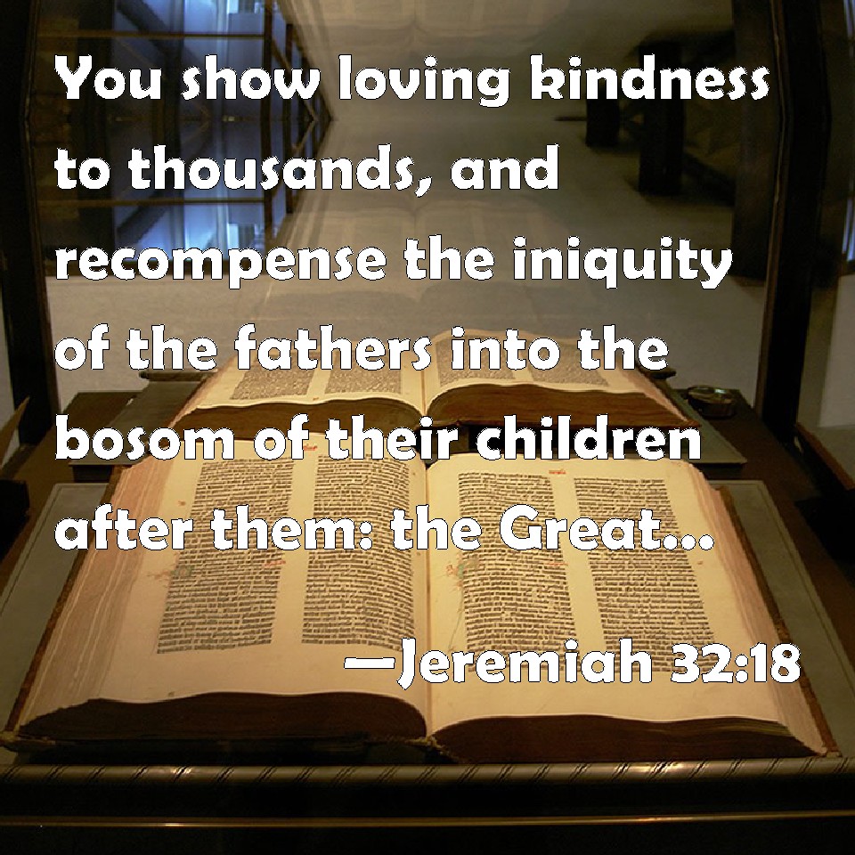 Choose a Background Jeremiah 32:18 You show loving kindness to thousands, and recompense the iniquity of the fathers into the bosom of their children after them: the Great, the Mighty God, the LORD of hosts, is his name, KJV: Thou shewest lovingkindness unto thousands, and recompensest the iniquity of the fathers into the bosom of their children after them: the Great, the Mighty God, the LORD of hosts, is his name, DRB: Thou shewest mercy unto thousands, and returnest the iniquity of the fathers into the bosom of their children after them: O most mighty, great, and powerful, the Lord of hosts is thy name. DBT: who shewest mercy unto thousands, and recompensest the iniquity of the fathers into the bosom of their children after them, thou, the great, the mighty God, Jehovah of hosts is his name; ERV: which shewest mercy unto thousands, and recompensest the iniquity of the fathers into the bosom of their children after them: the great, the mighty God, the LORD of hosts is his name: WBT: Thou showest loving-kindness to thousands, and recompensest the iniquity of the fathers into the bosom of their children after them: the Great, the Mighty God, JEHOVAH of hosts, is his name, WEB: who show loving kindness to thousands, and recompense the iniquity of the fathers into the bosom of their children after them; the great, the mighty God, Yahweh of Armies is his name; YLT: Doing kindness to thousands, and recompensing iniquity of fathers into the bosom of their sons after them; God, the great, the mighty, Jehovah of Hosts is His name,Links Jeremiah 32:18 NIV • Jeremiah 32:18 NLT • Jeremiah 32:18 ESV • Jeremiah 32:18 NASB • Jeremiah 32:18 KJV • Jeremiah 32:18 Interlinear • Jeremiah 32:18 Commentaries • Jeremiah 32:18 Parallel Texts • Jeremiah 32:18 Bible Apps • Jeremiah 32:18 Parallel • Bible Hub |